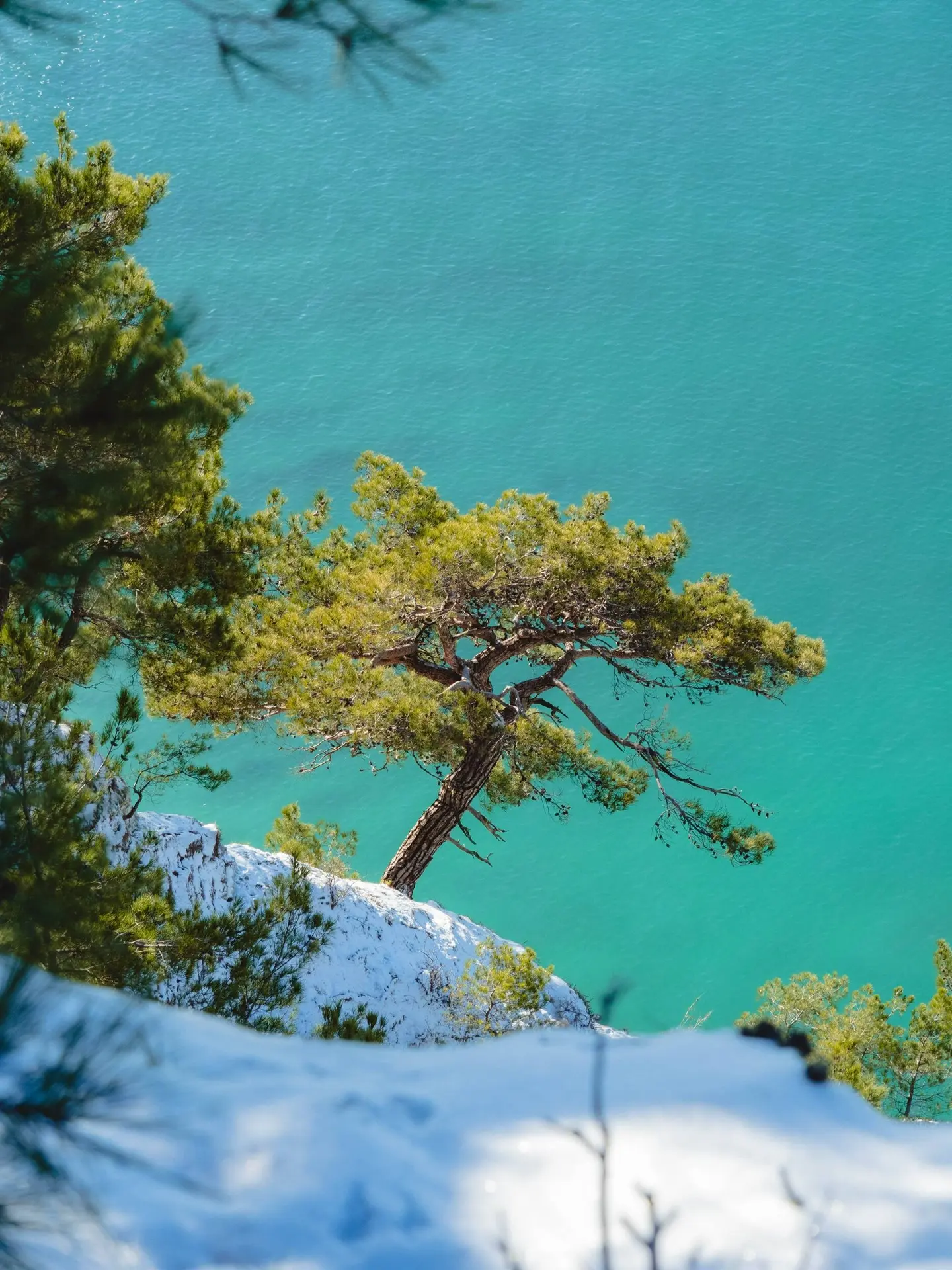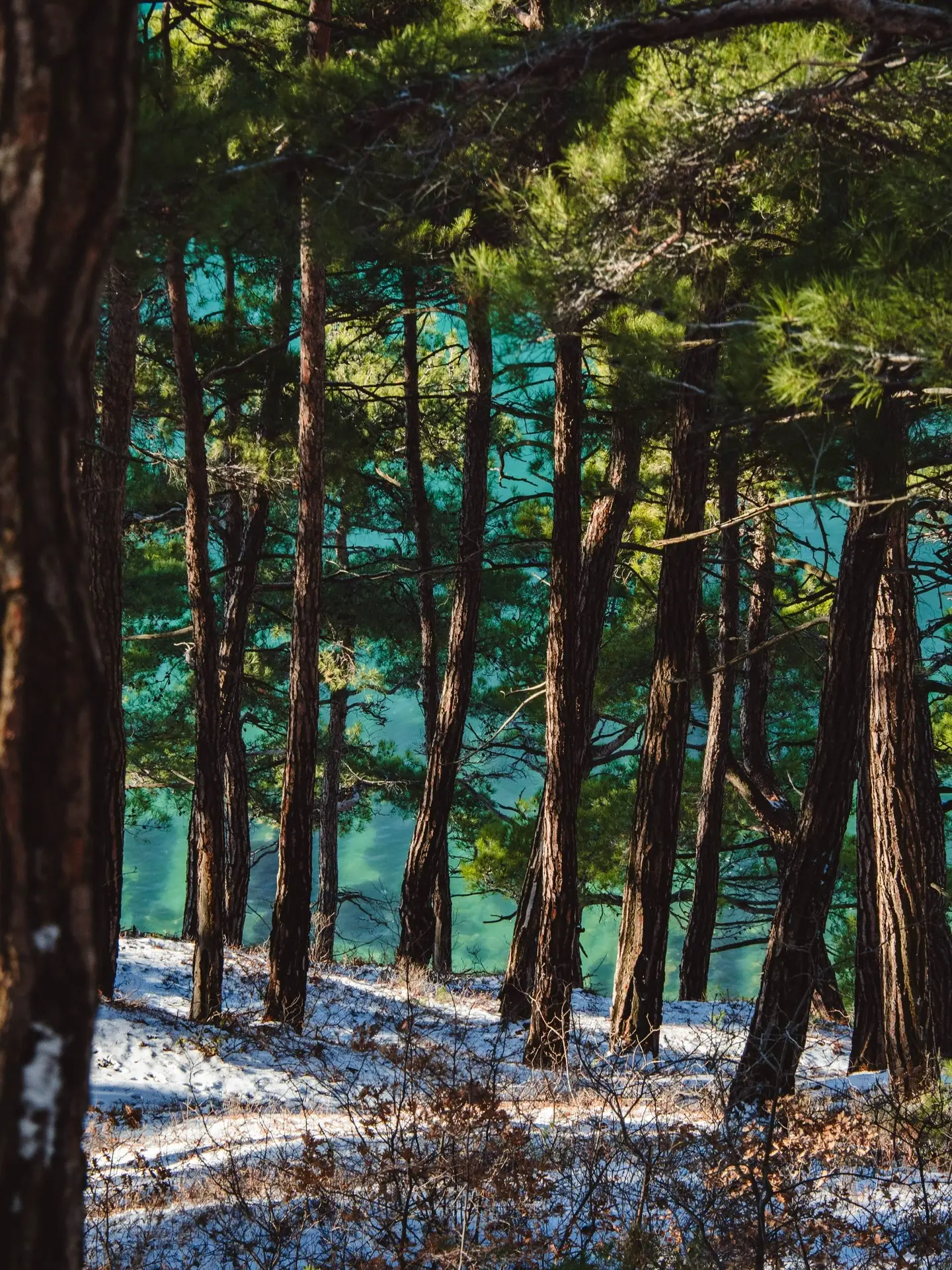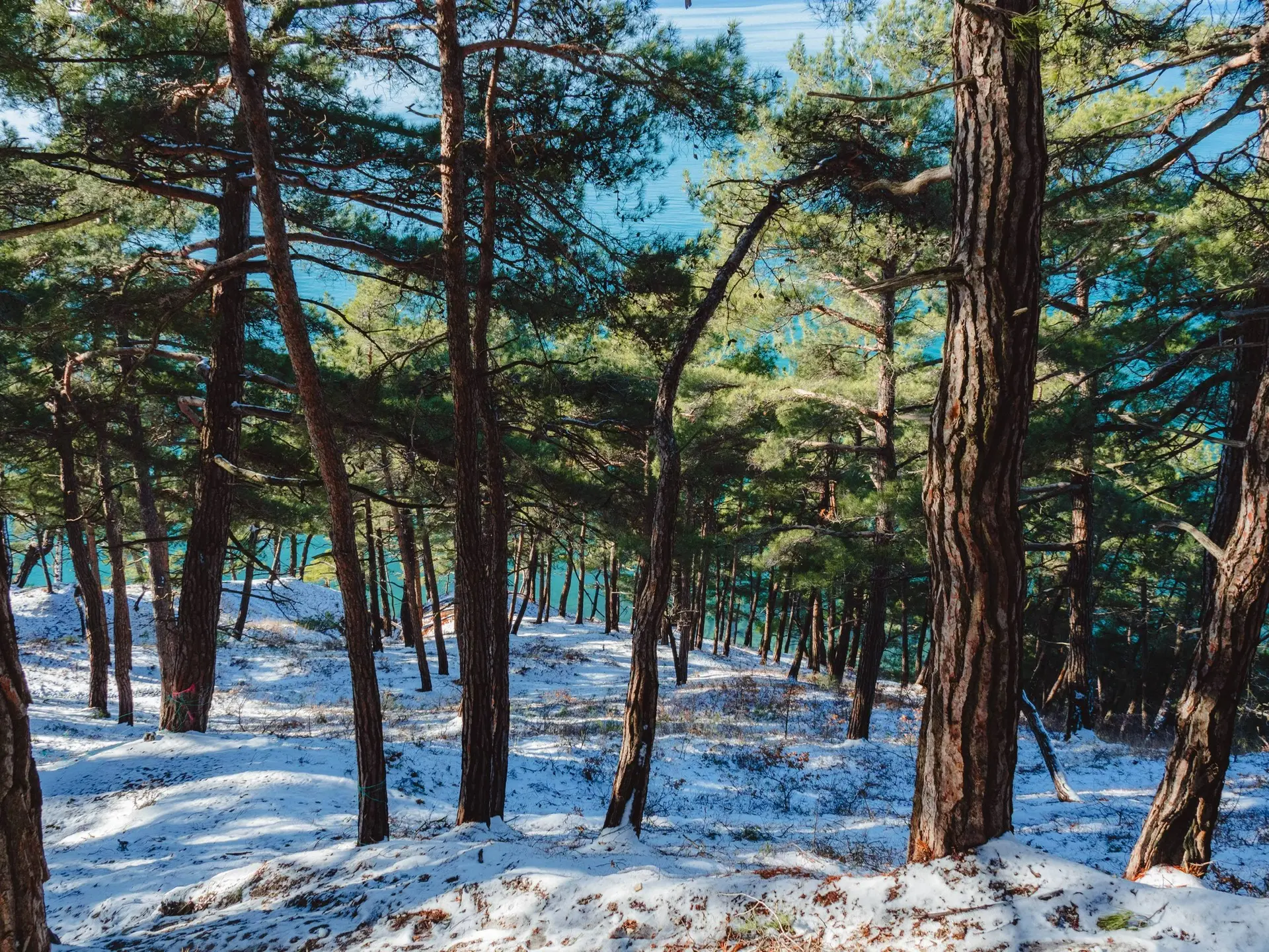 Тут навалило снега, как не было в этих местах, наверное лет 5. И теперь, и без того фантастически красивое место превратилось совсем уж в сказочное: белоснежный снег, изумрудные сосны и бирюзовое море.