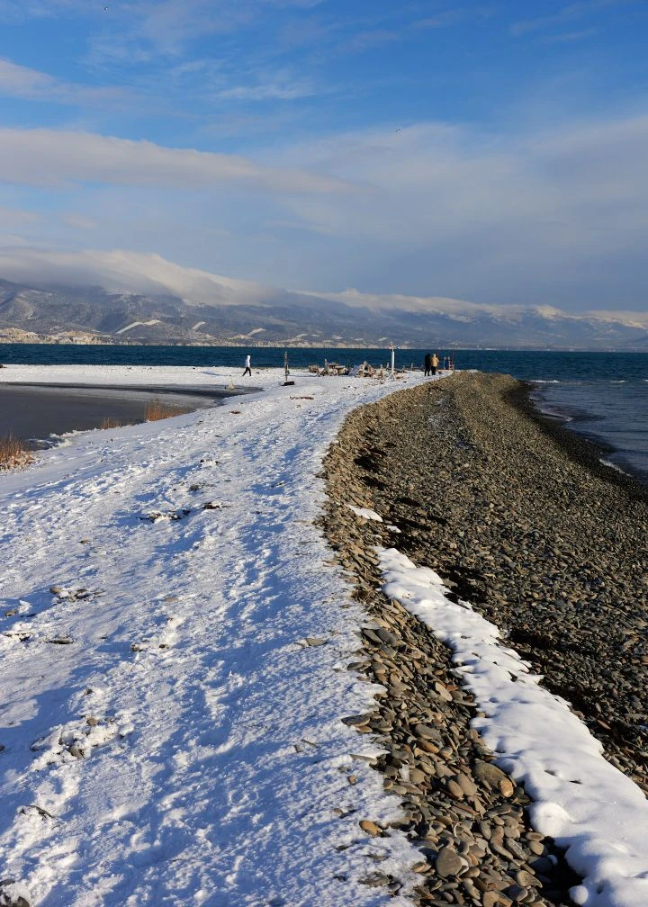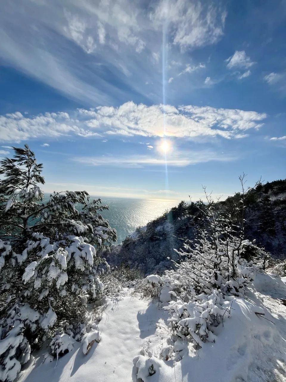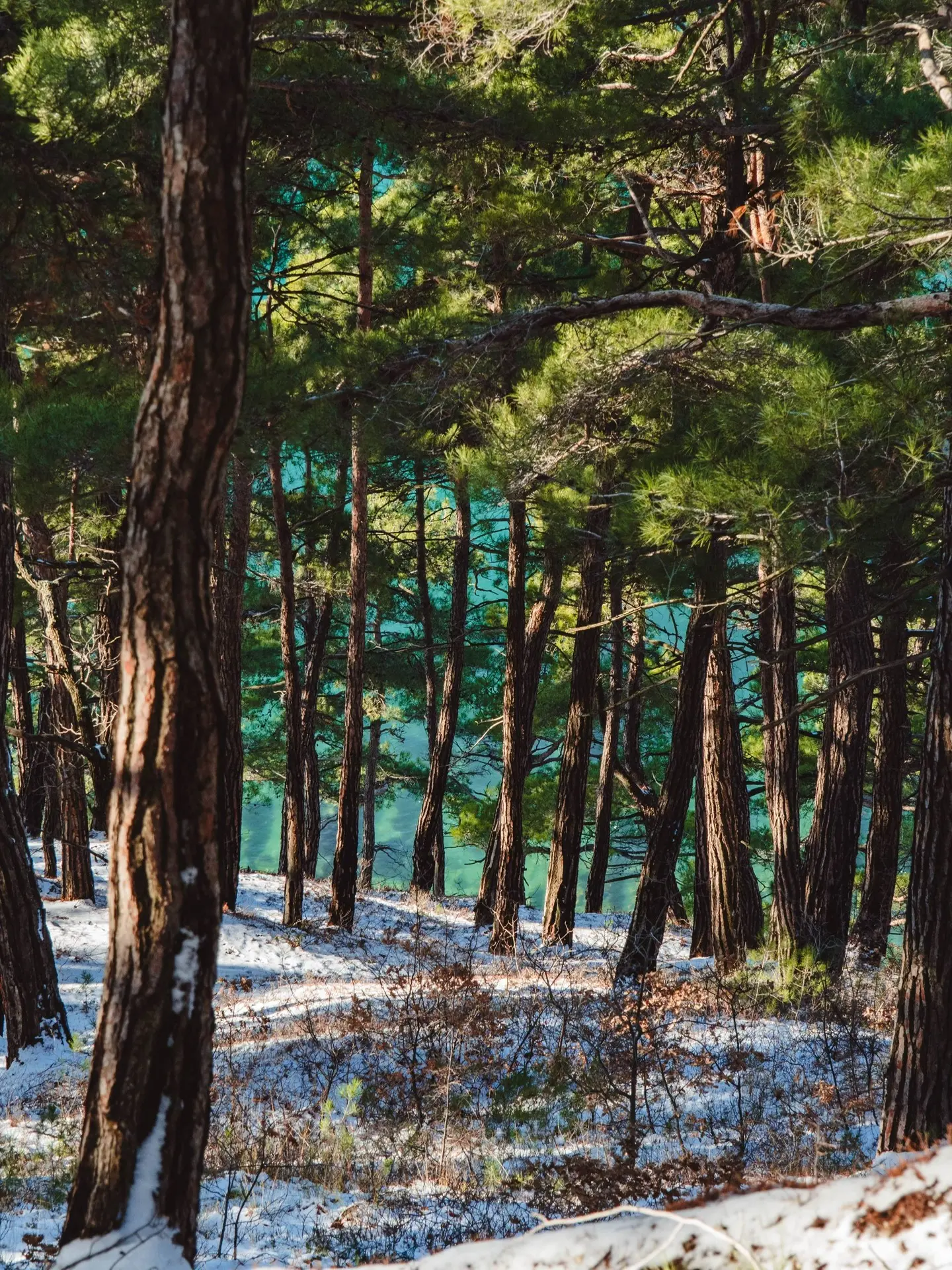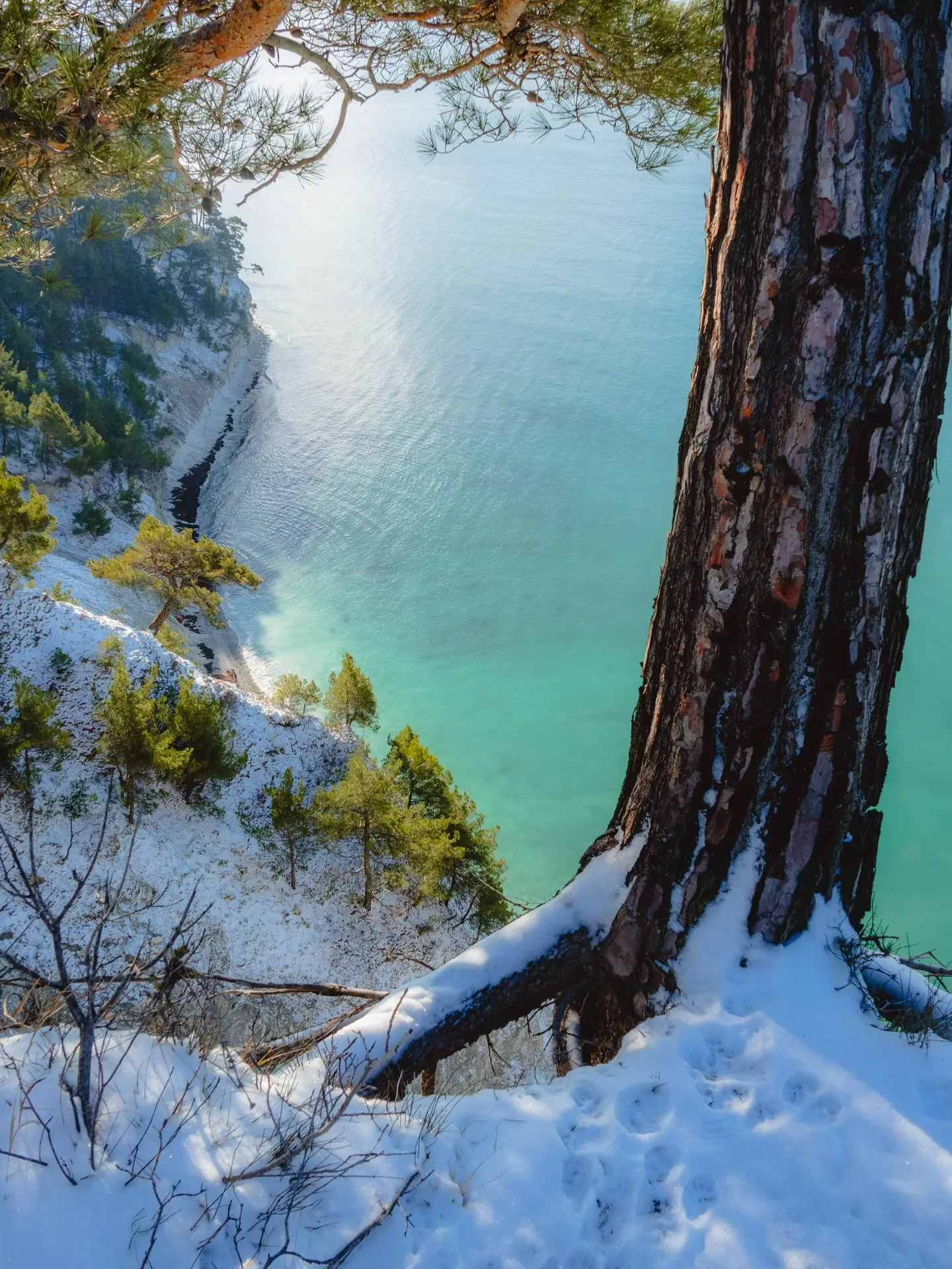 Тут навалило снега, как не было в этих местах, наверное лет 5. И теперь, и без того фантастически красивое место превратилось совсем уж в сказочное: белоснежный снег, изумрудные сосны и бирюзовое море.