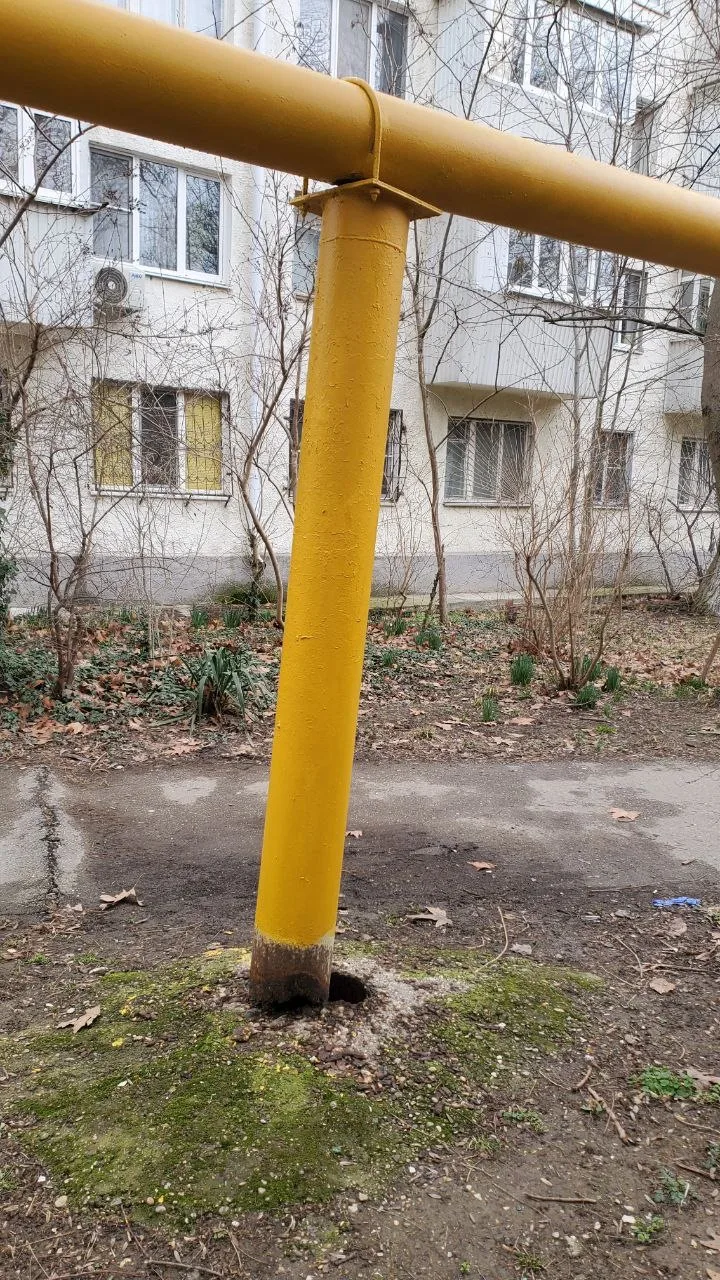 Висит столб на газовой трубе. За домом проспект Ленина 51.