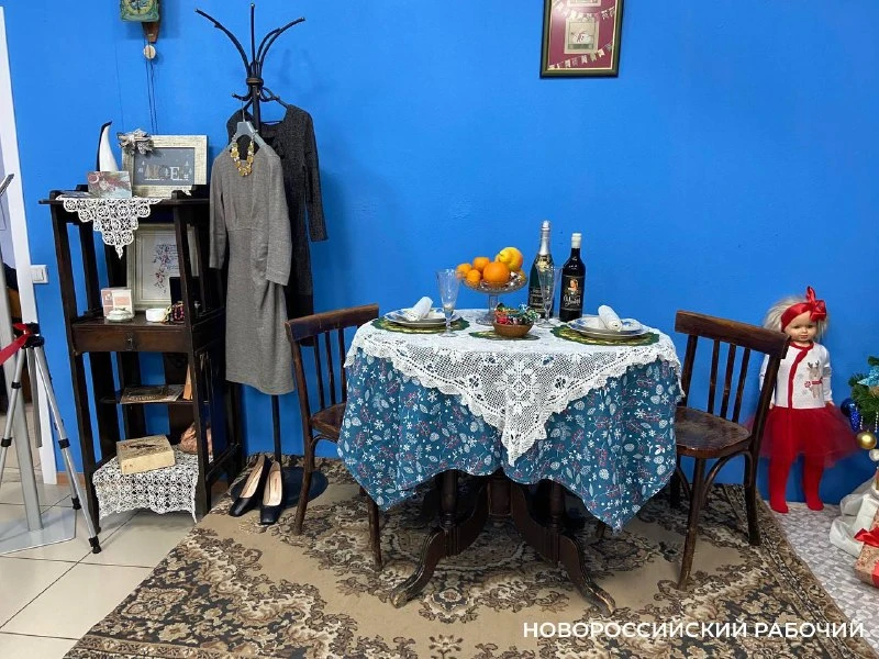 Новогодние украшения, в том числе игрушки, сделанные своими руками, гирлянды из бумажных фонариков и… внимание! – накрытый к празднику стол. Сразу предупреждаем, что конфеты в вазочке: это популярные в прошлом веке «Мишка на Севере» и «Мишки в лесу», без которых не обходился ни один новогодний подарок, — муляжи. А вот мандаринки – настоящие. Телевизор, по которому смотрели «Голубой огонек», женский наряд для празднования Нового года, — все это помогает окунуться в другое временное пространство.
