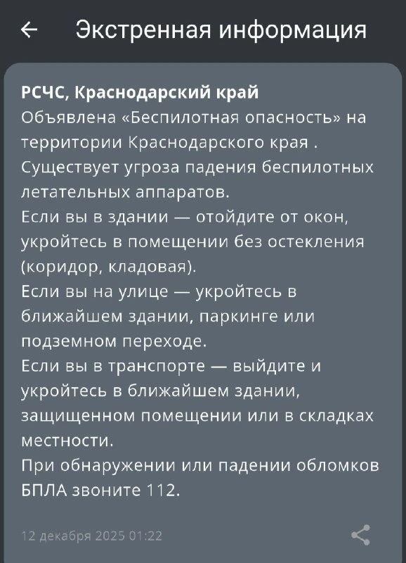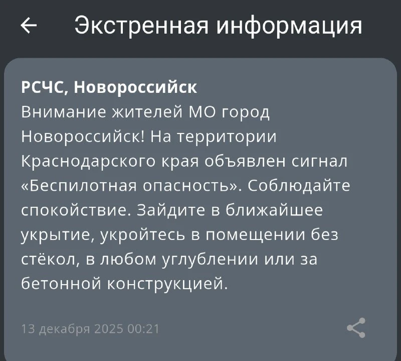 ❗РСЧС Новороссийск: на территории Краснодарского края объявлен сигнал "беспилотная опасность"