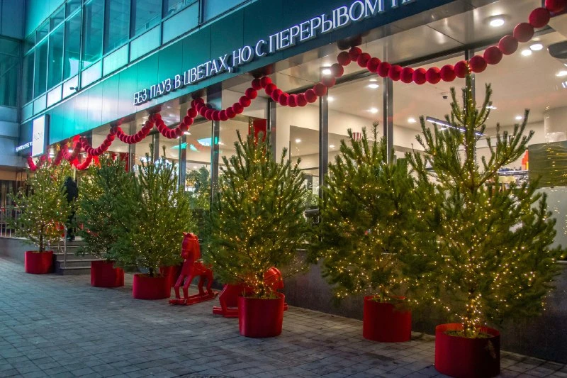 Фотозарисовки... Живые сосны в горшках, это очень хорошо! Новогодний троллейбус. Местами дождь. Красивый цвет у моря сегодня был - бирюзовый...