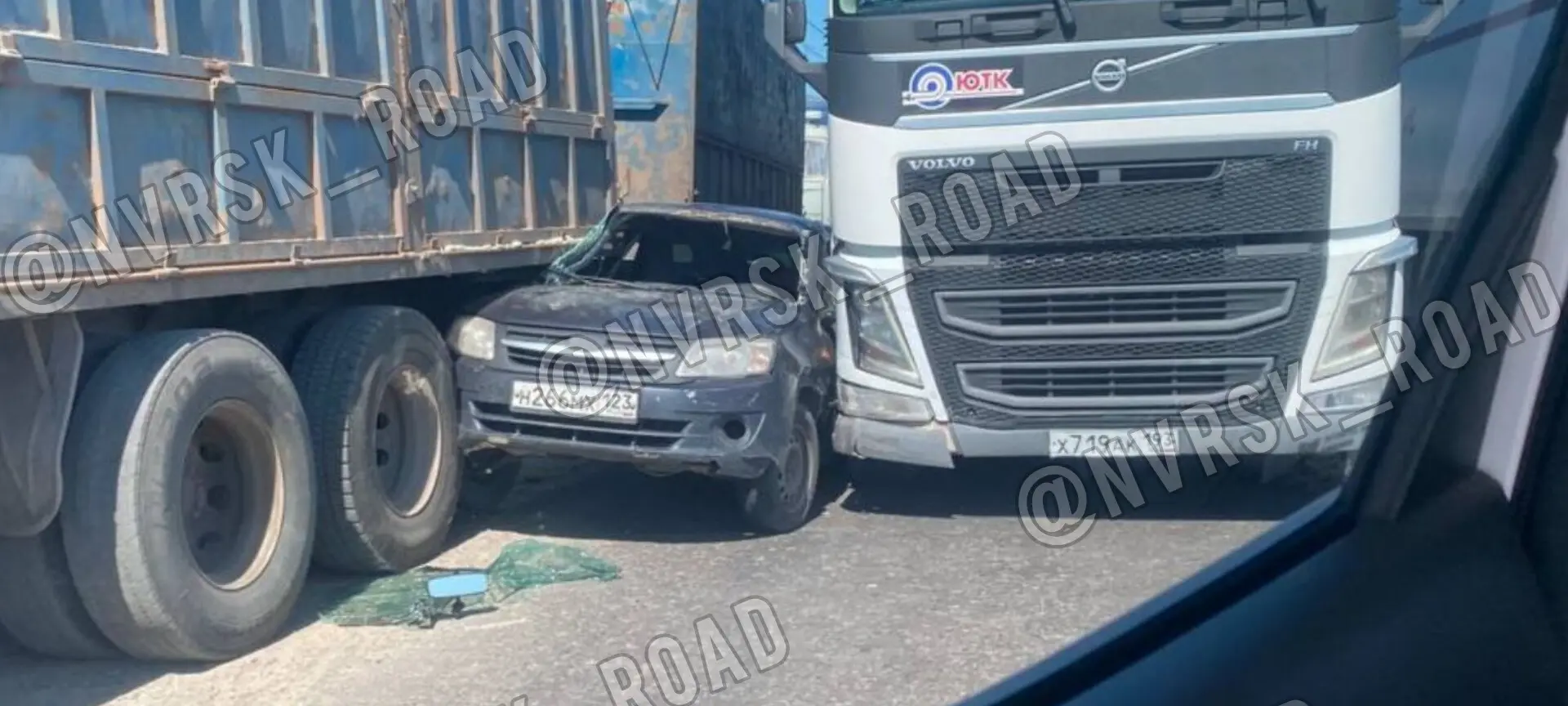 Легковая зажата между двумя фурами.