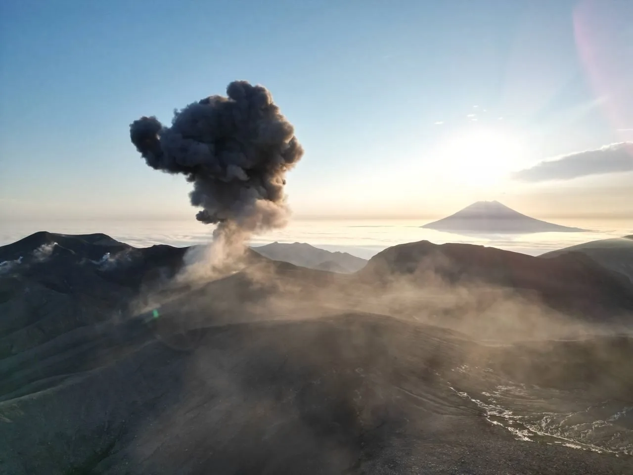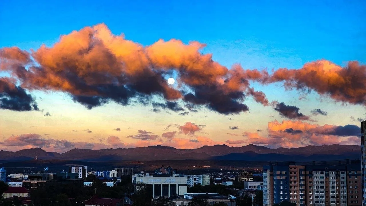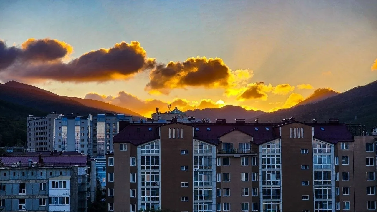 Извержение действующего вулкана Эбеко совпало с закатом солнца, создав поистине впечатляющую картину. Столбы пепла и пара, подсвеченные последними лучами заходящего солнца.