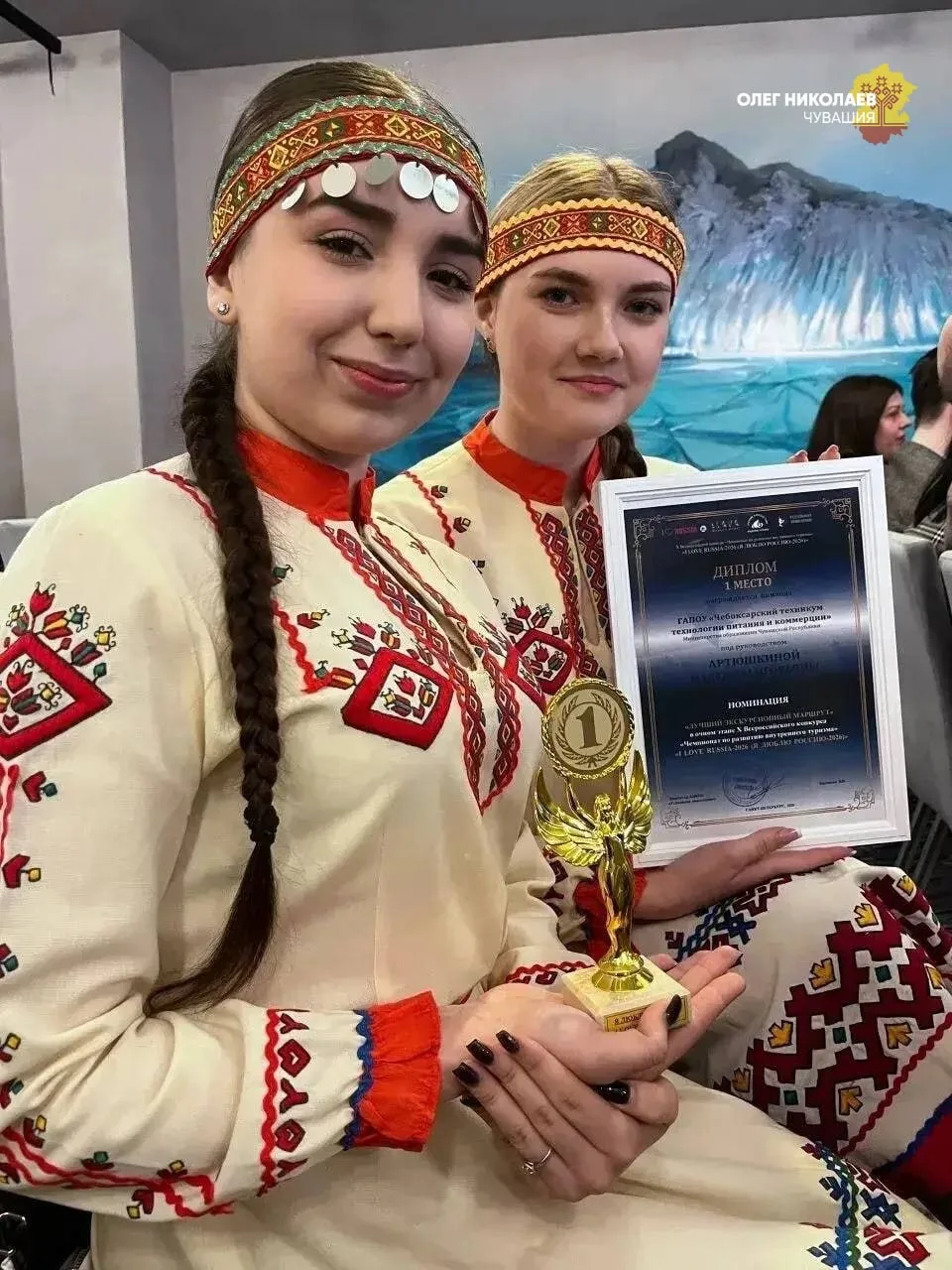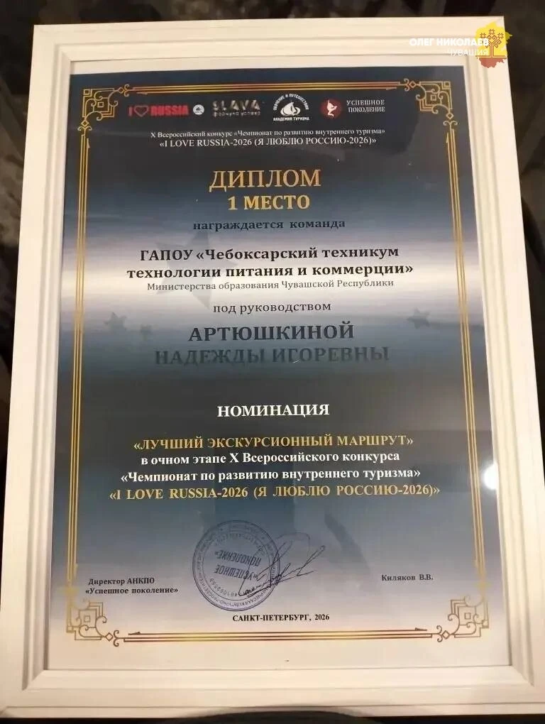 Рад сообщить, что студенты Чебоксарского техникума технологии питания и коммерции Инна Григорьева и Елена Торговцева победили на X Всероссийском чемпионате «I LOVE RUSSIA-2026» в Санкт-Петербурге, заняв первое место в номинации «Лучший экскурсионный маршрут».