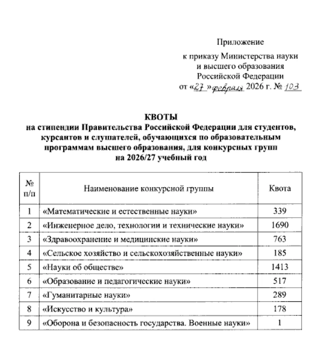 Распределены квоты на стипендии правительства РФ на 2026-2027 учебный год. Больше всего стипендии будет по конкурсной группе «Инженерное дело, технологии и технические науки» — 1 690. Меньше всего — одна — по группе «Оборона и безопасность государства. Военные науки».