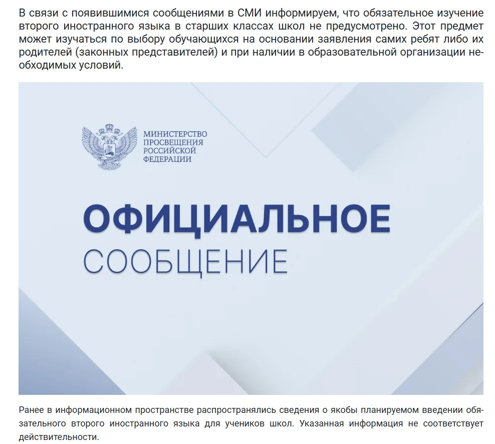 «Информация о якобы планируемом введении обязательного второго иностранного языка для учеников школ не соответствуют действительности», — заявляют в Минпросвещения. Сведения, которые «распространялись в информационном пространстве» и которые опровергают в министерстве, — это, в частности, комментарий председателя Госдумы Вячеслава Володина.