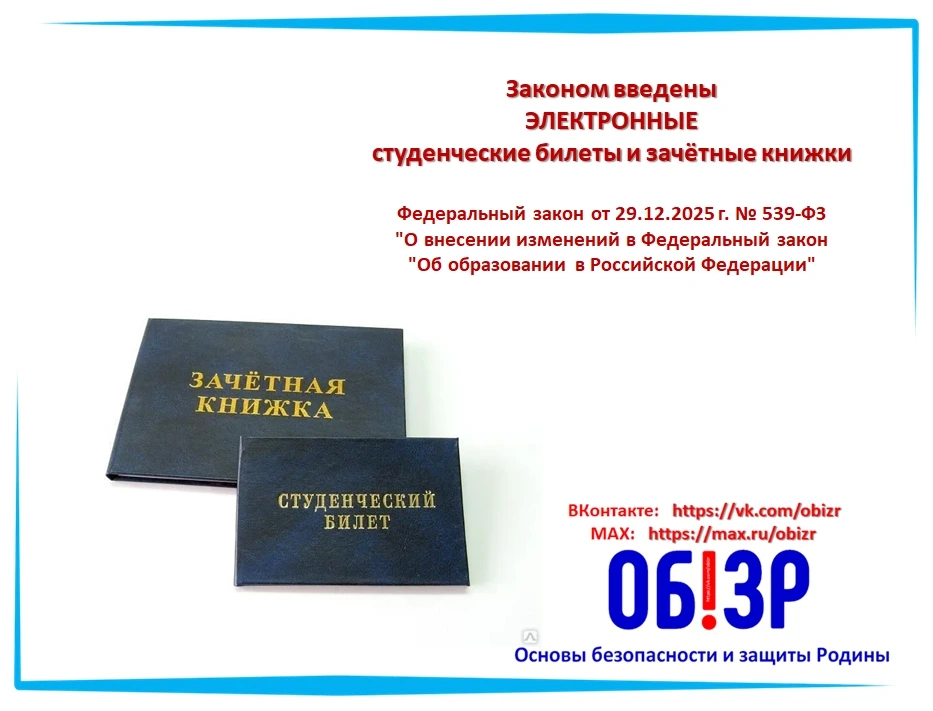Информация для тех, кто работает со студентами, а так же для общего понимания и разъяснения будущим абитуриентам - нашим выпускникам! В соответствии с Федеральным законом от 29.12.2025 г. №539-ФЗ «О внесении изменений в Федеральный закон „Об образовании в Российской Федерации“» студенческие билеты и зачётные книжки для обучающихся в вузах переводятся в электронный формат.