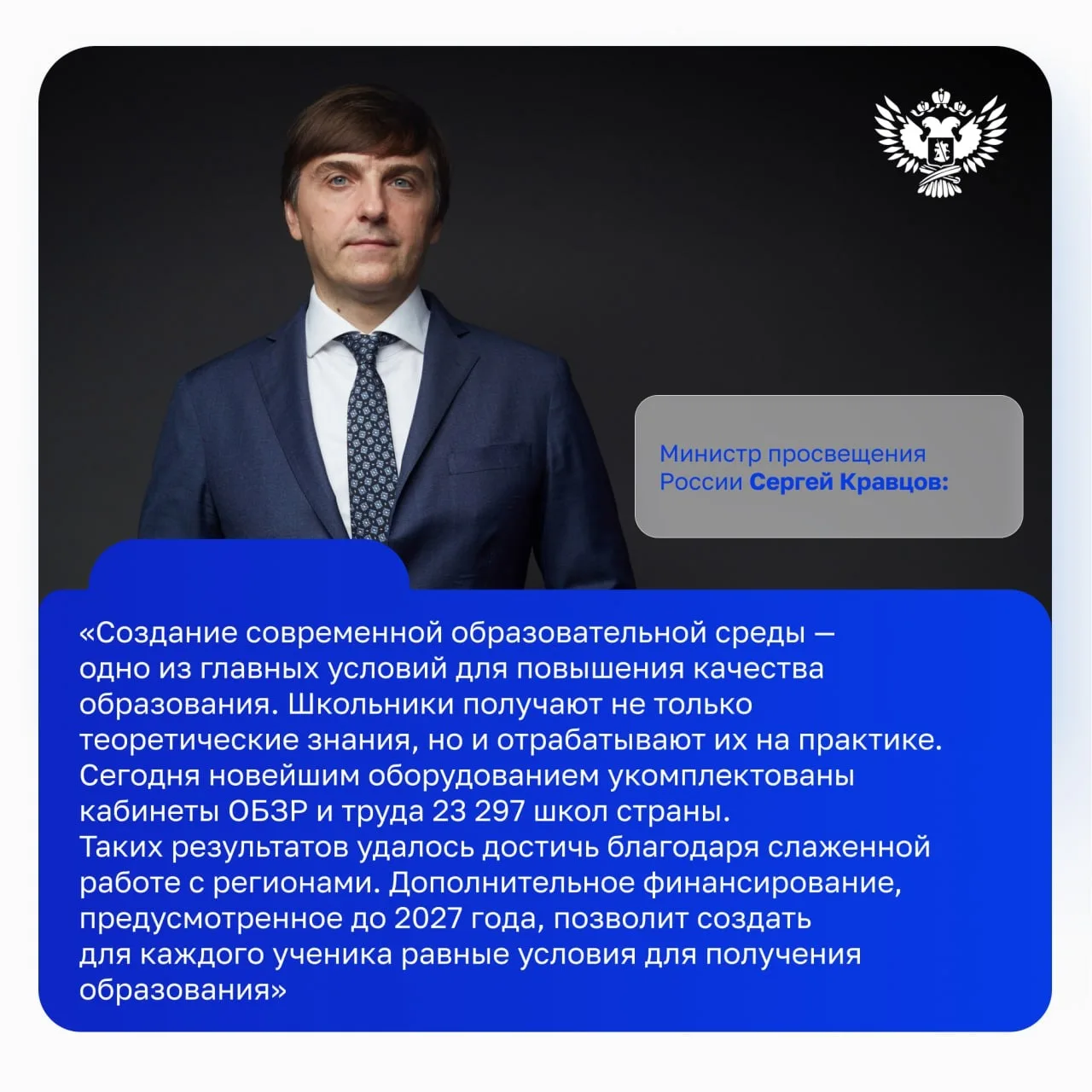 "Эта мера призвана создать равные минимальные условия для обучения во всех школах страны, гарантировать реализацию образовательной программы в полном объеме независимо от географического положения школы. Лабораторные и практические работы станут нормой в любой школе страны, от столицы до малого города", – подчеркнул он.