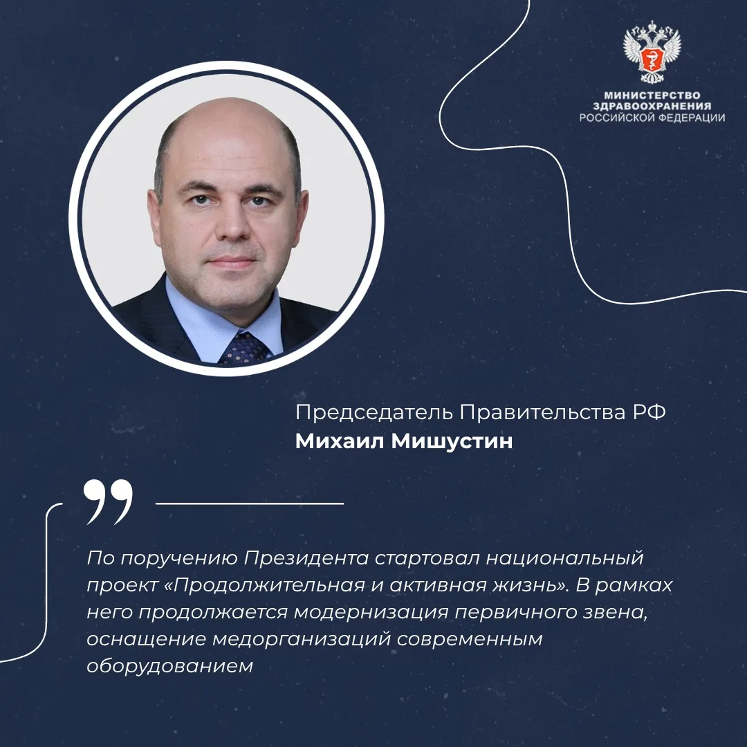 — По поручению Президента стартовал национальный проект «Продолжительная и активная жизнь». В рамках него продолжается модернизация первичного звена, оснащение медорганизаций современным оборудованием, — напомнил председатель Правительства РФ.
