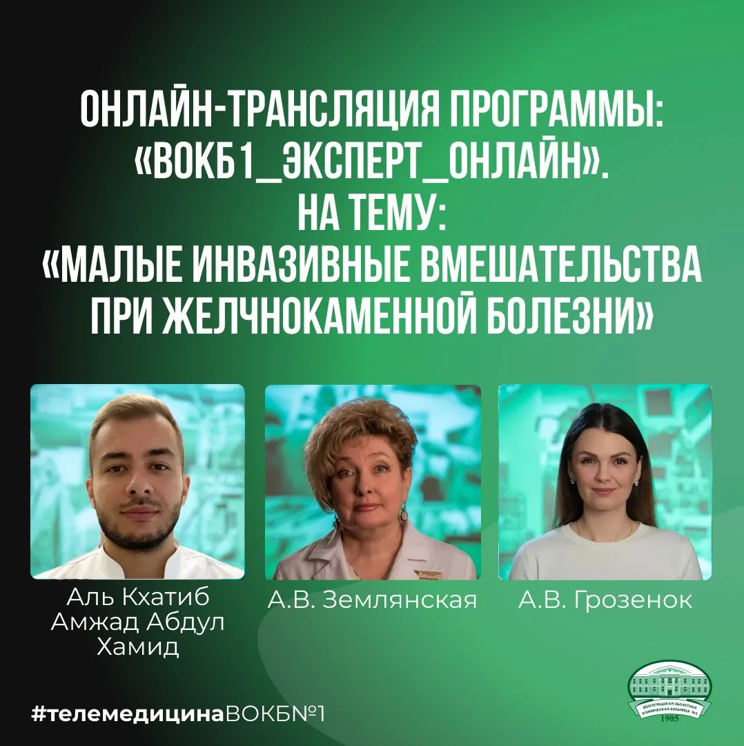 ✅ 20 апреля в 16:00 по Московскому времени приглашаем Вас присоединиться к прямой трансляции программы «ВОКБ1_ЭКСПЕРТ_ОНЛАЙН» из Регионального телемедицинского центра ВОКБ №1 на тему «Малоинвазивные вмешательства при желчнокаменной болезни».