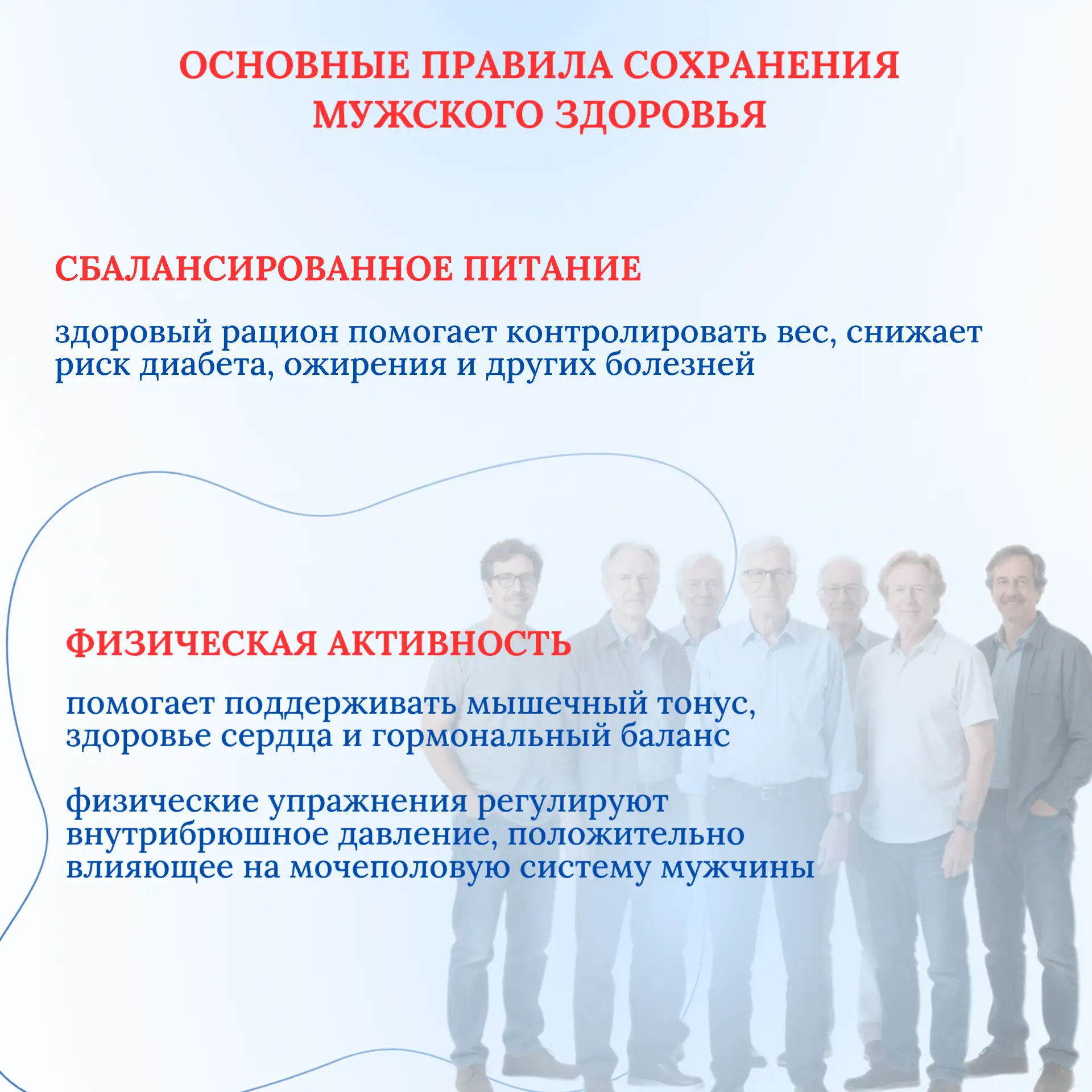 Основные принципы сохранения мужского здоровья включают регулярную физическую активность, правильное питание, отказ от вредных привычек и своевременное обращение к врачу. Забота о своем здоровье должна стать частью повседневной жизни.