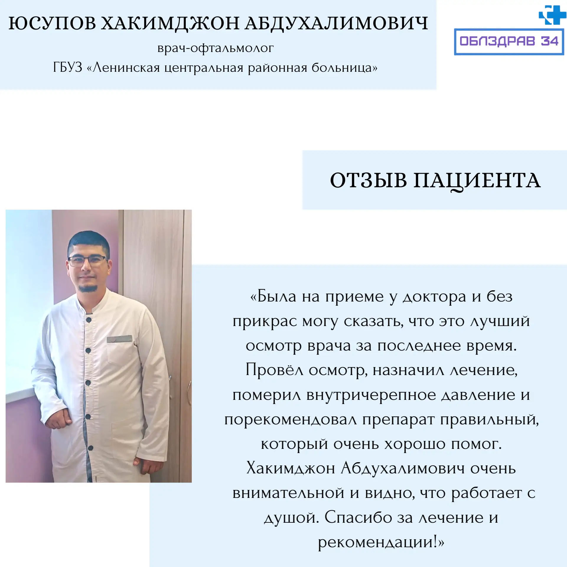 Юсупов Хакимджон Абдухалимович - врач-офтальмолог Ленинской ЦРБ.