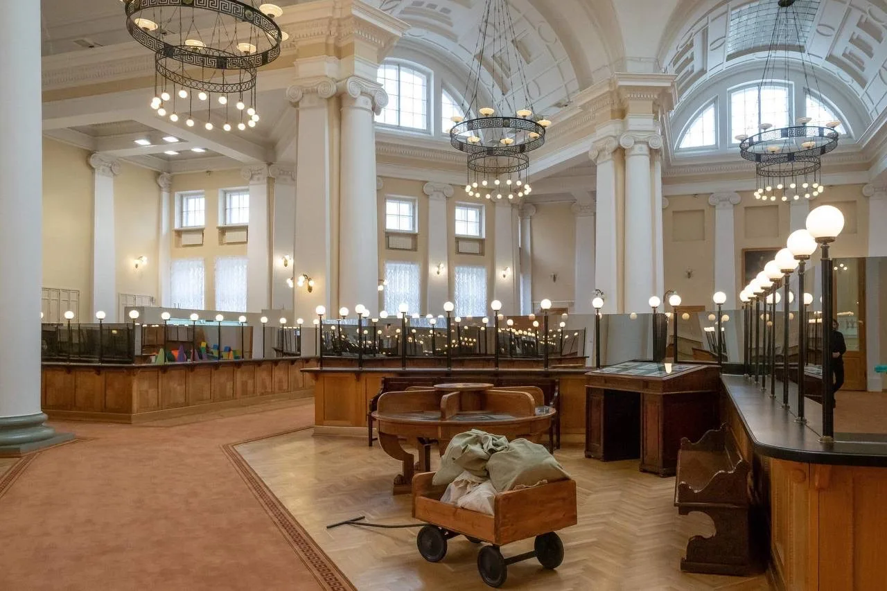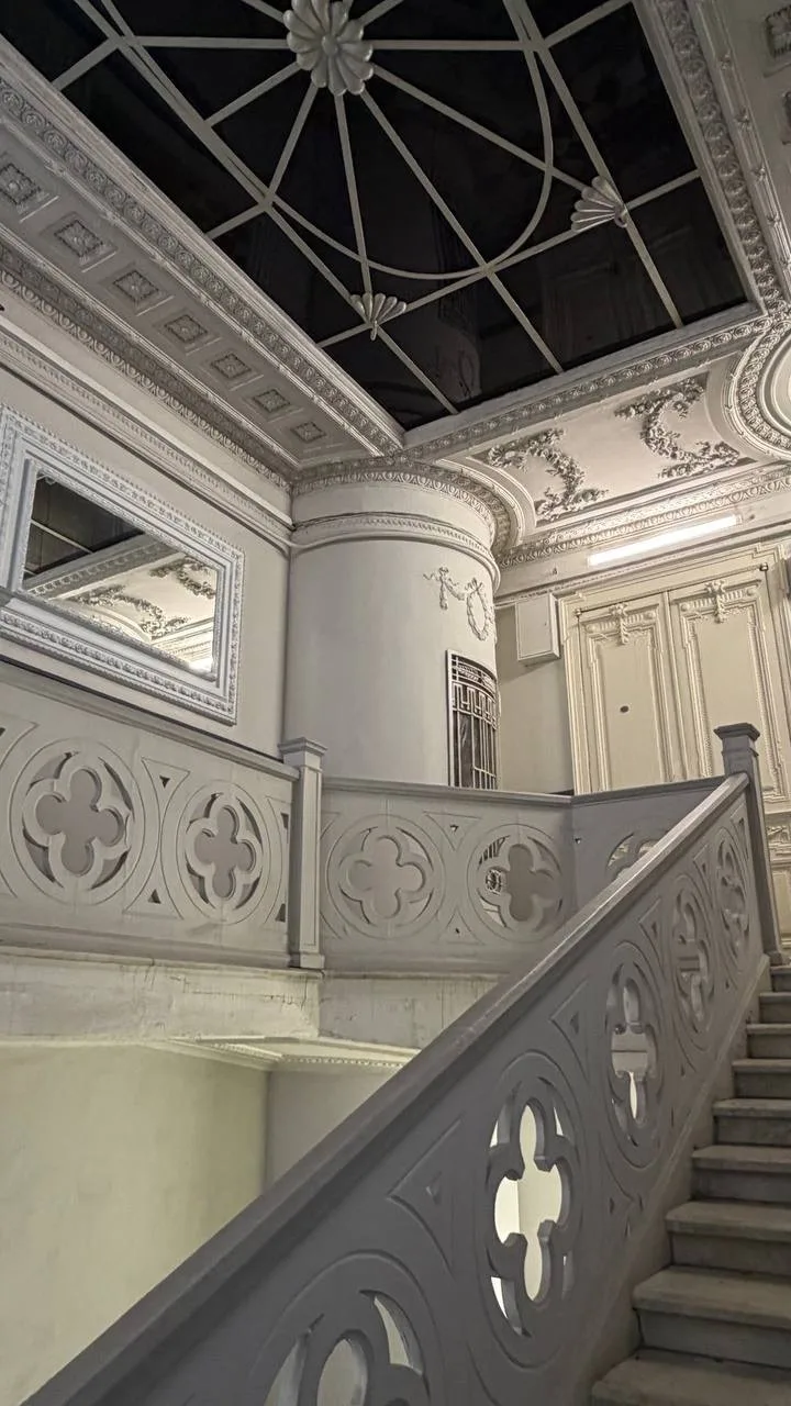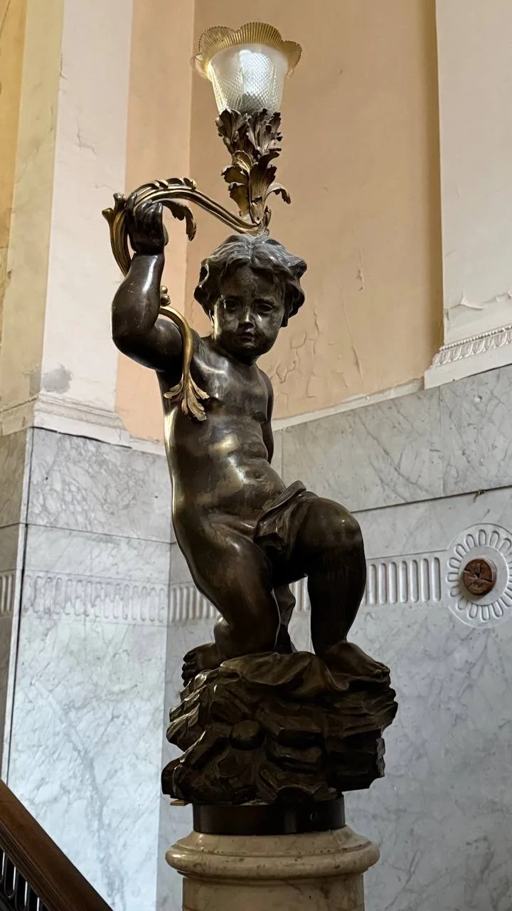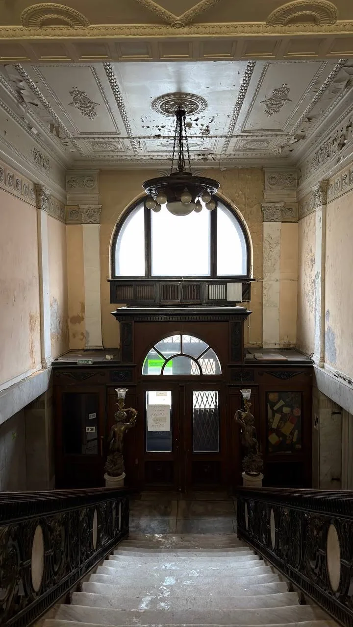 Сохранились мраморная лестница, метлахская плитка, лепнина на потолке, люстра и фонари с купидонами. Единственный нюанс — помещению очень нужен ремонт: тусклый свет и осыпающаяся штукатурка приводят в уныние.
