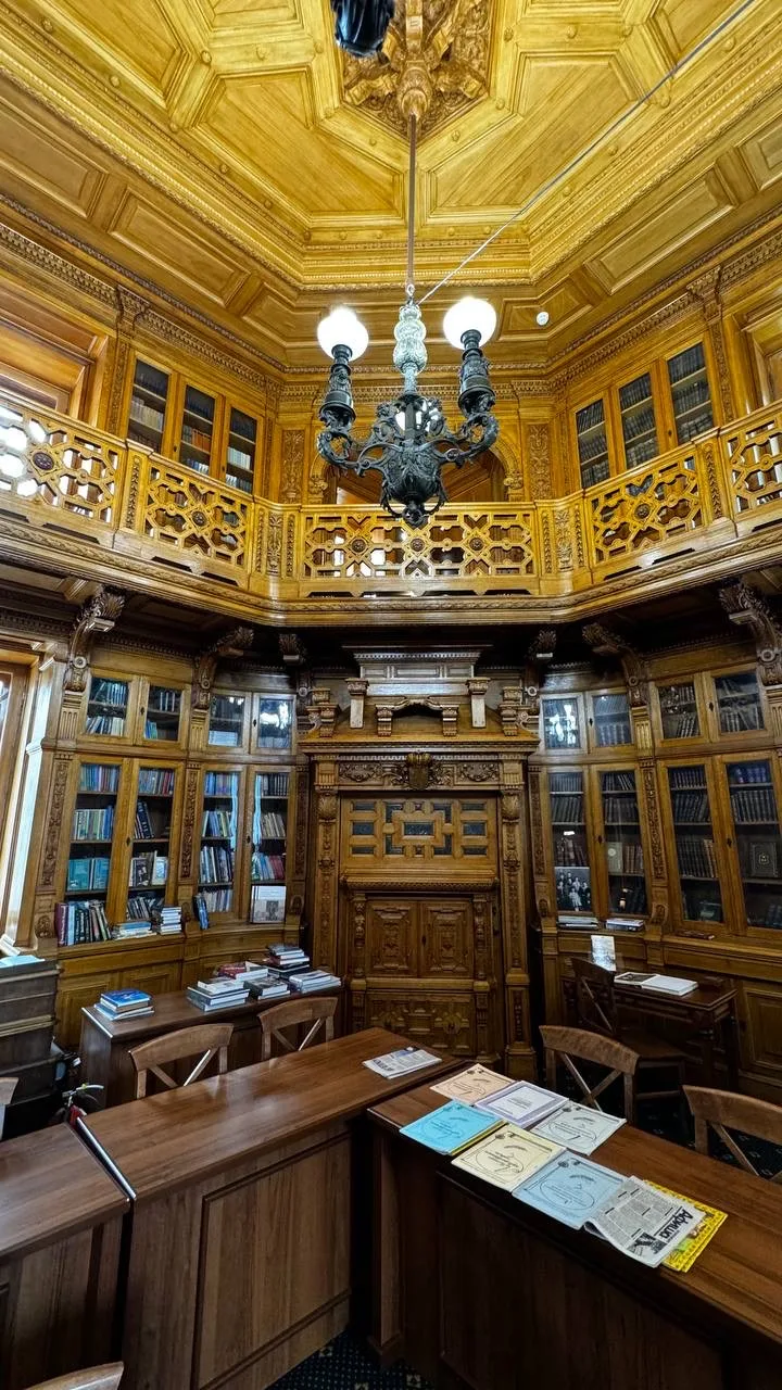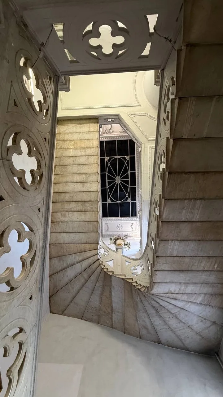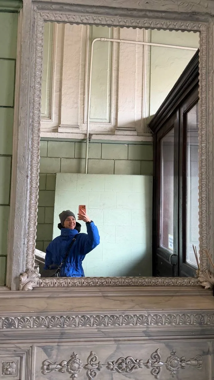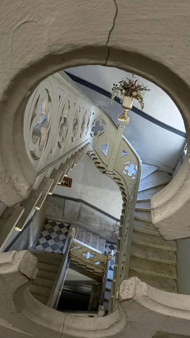 Сохранились мраморная лестница, метлахская плитка, лепнина на потолке, люстра и фонари с купидонами. Единственный нюанс — помещению очень нужен ремонт: тусклый свет и осыпающаяся штукатурка приводят в уныние.