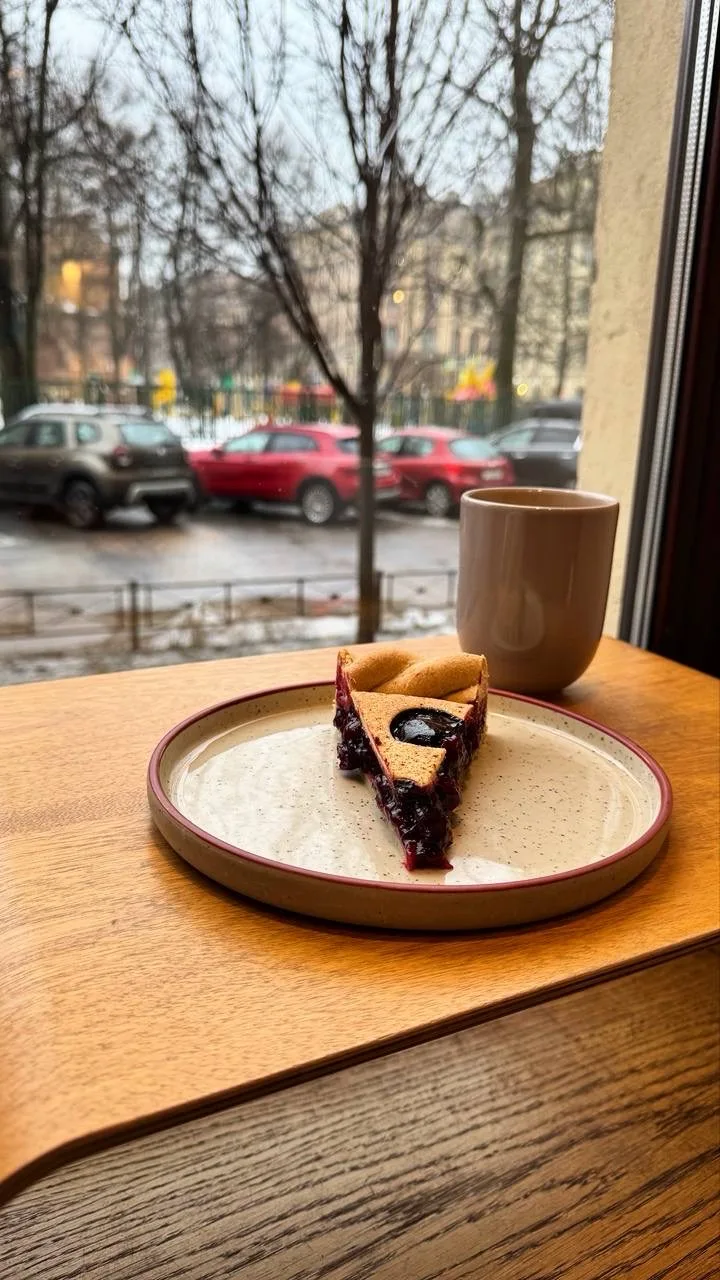 Собственно, за сырниками и шла, но увидела на витрине вишневый пирог (290 руб.), а дальше всё как в тумане. Обнаружила себя довольную с пустой тарелкой и отличным бамблом (390 руб.) в руке. Пирог очень вкусный: сочный, на хрустящей основе. Кофе тоже достойный. Придется возвращаться за сырниками😋