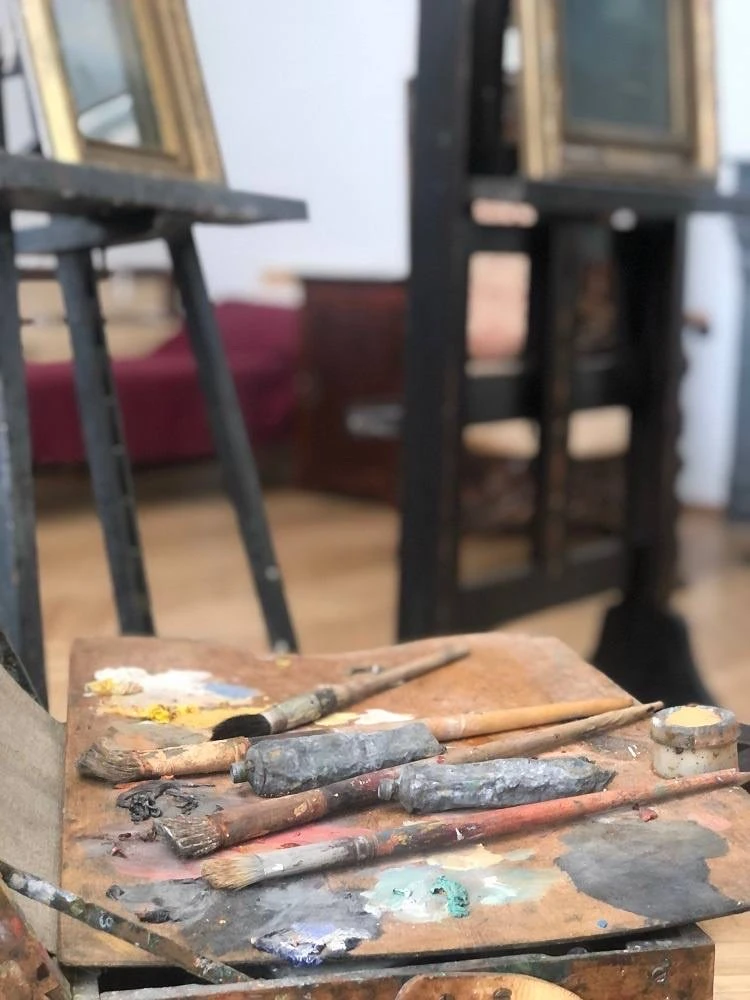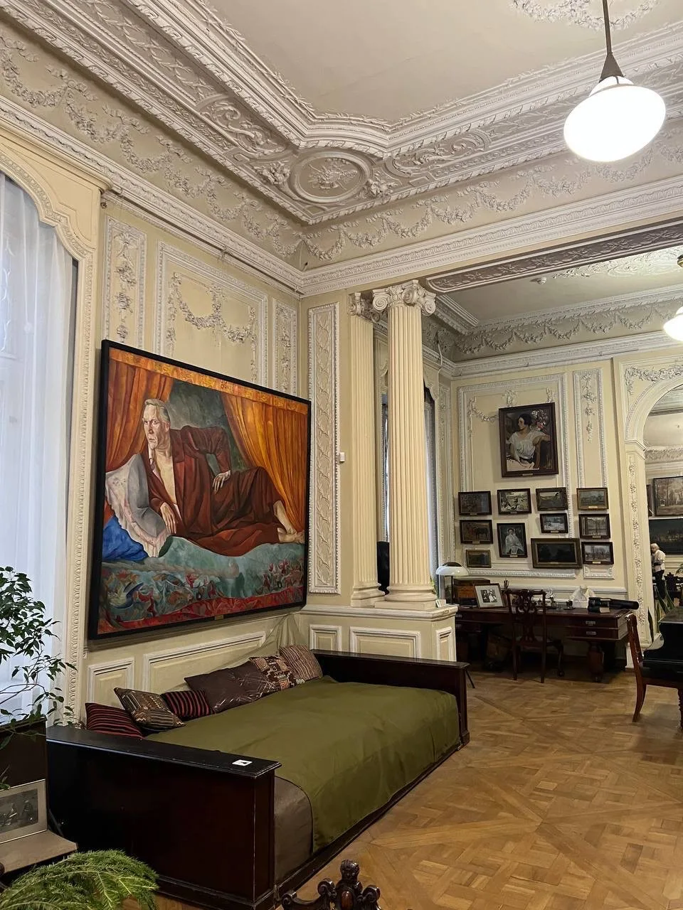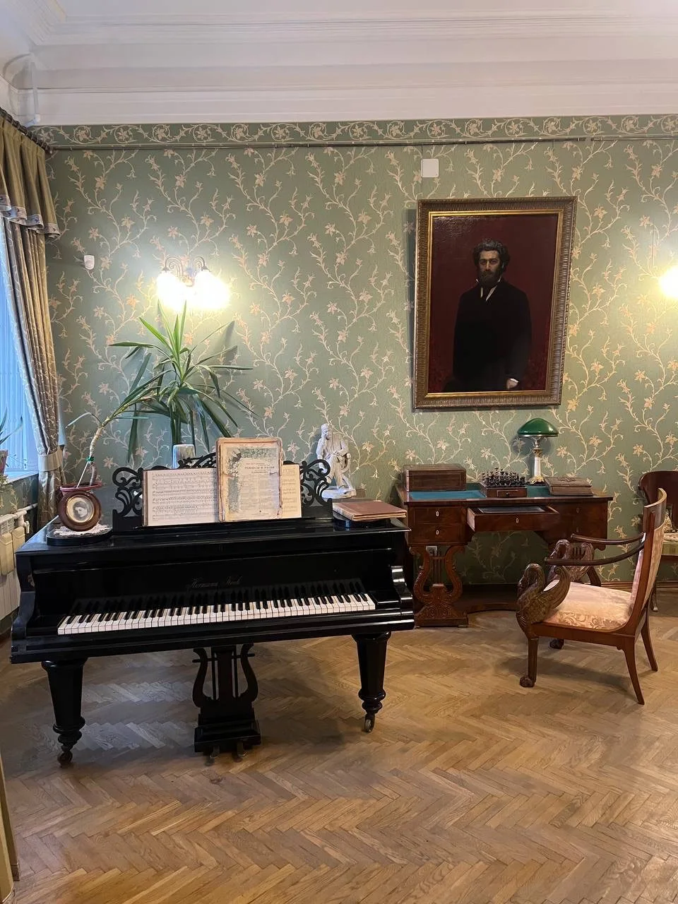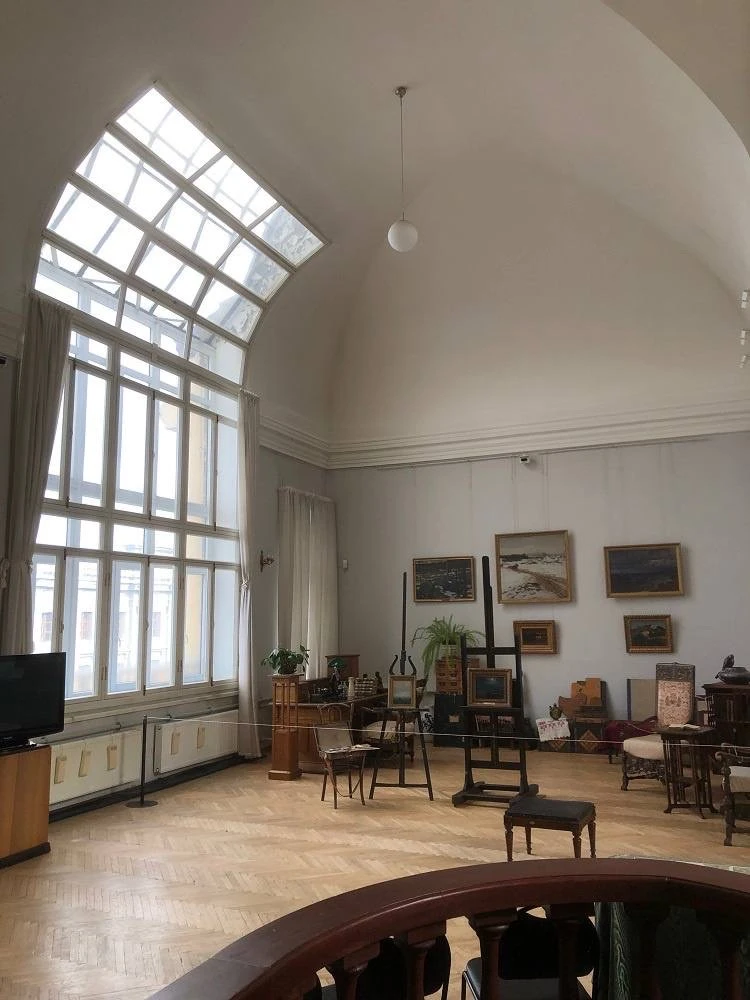 В квартире живописец поселился после свадьбы. Она небольшая, но атмосферная. Интересны видовая мансарда с огромными окнами, старый рояль и портрет самого художника кисти И. Крамского.