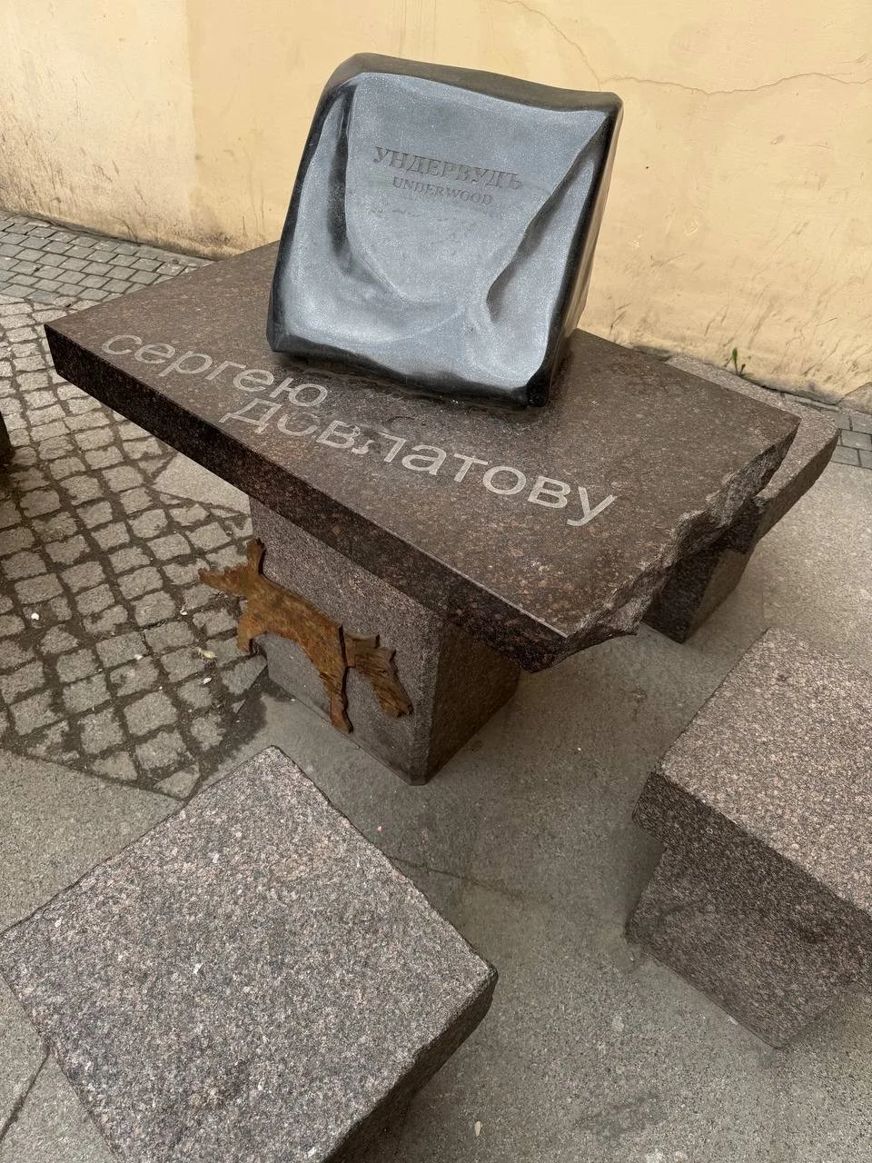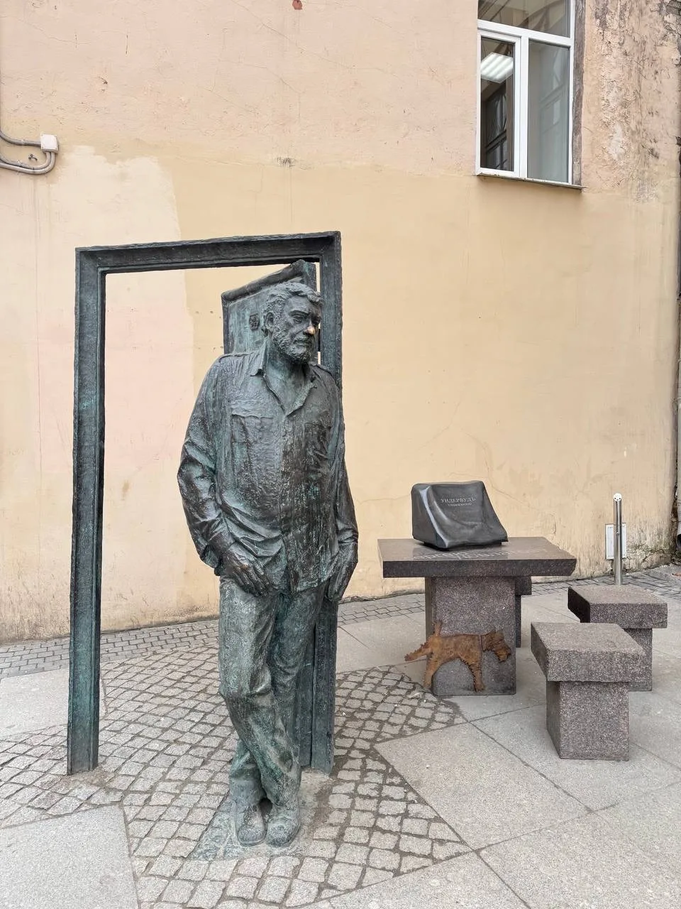 На улице Рубинштейна,23 стоит памятник Сергею Довлатову: писатель опирается на дверной косяк, а рядом — печатная машинка фирмы «Ундервуд» и любимая собака Глаша. Место выбрано неспроста, здесь писатель жил с 1944 по 1975 г.