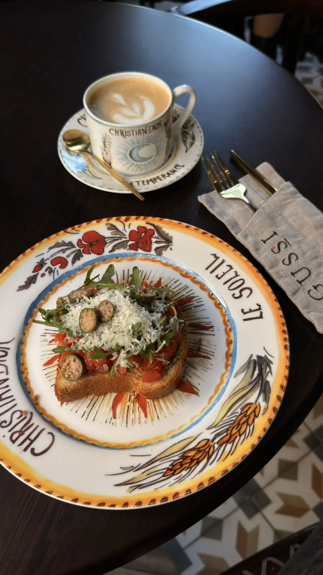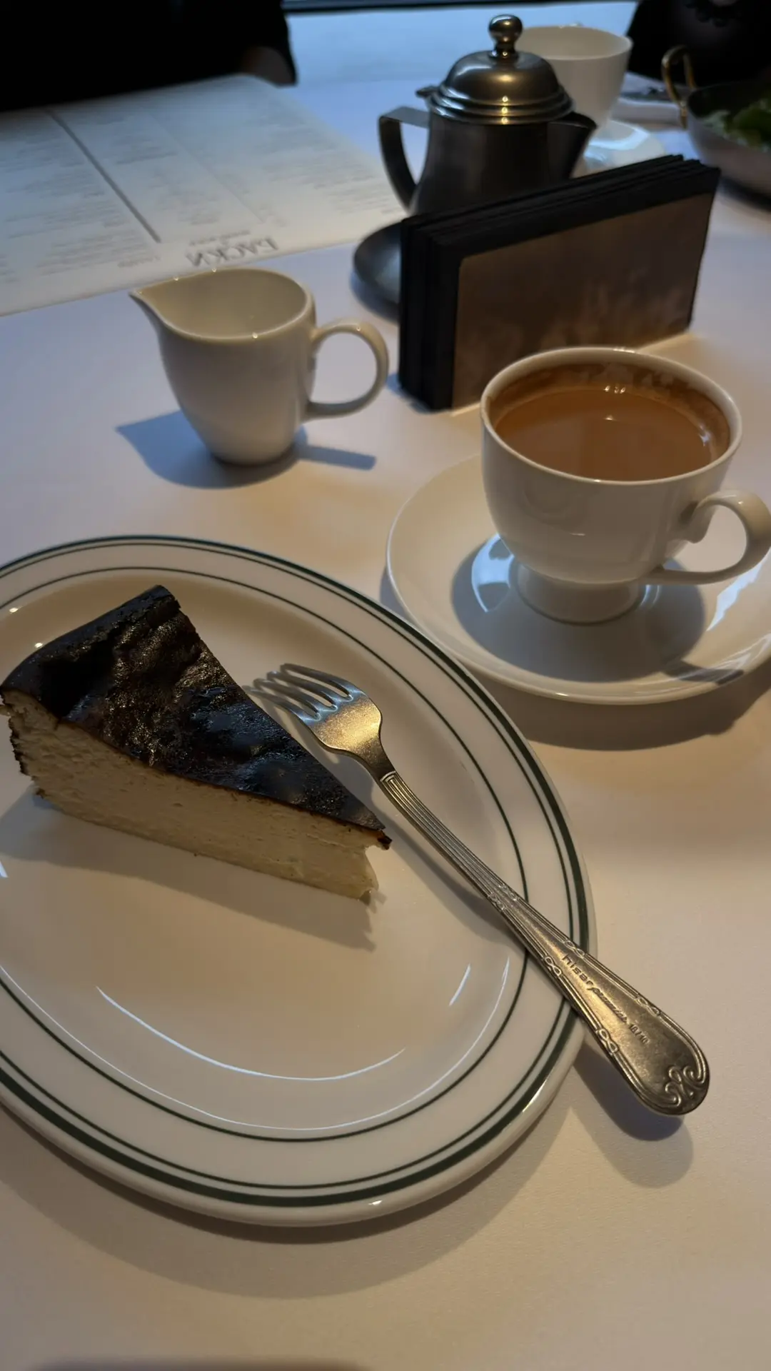 Честно говоря, из всего меню я успела попробовать только десерты, но обязательно вернусь на полноценный ужин. А пока делюсь главным открытием: баскский чизкейк здесь просто невероятный. К нему не подают ни ягод, ни соусов — он сам по себе самодостаточный и бесподобный. Вот смело рекомендую!