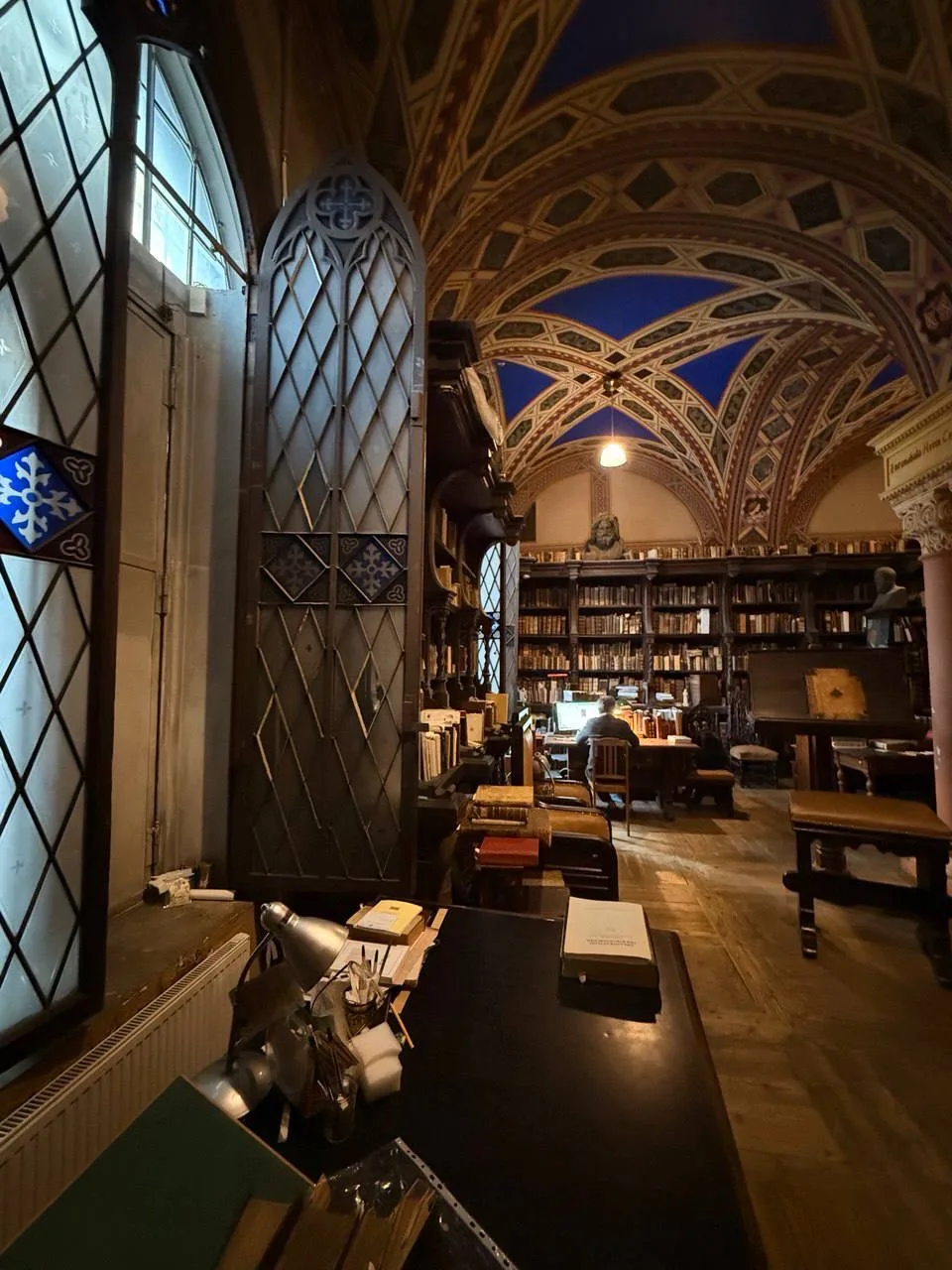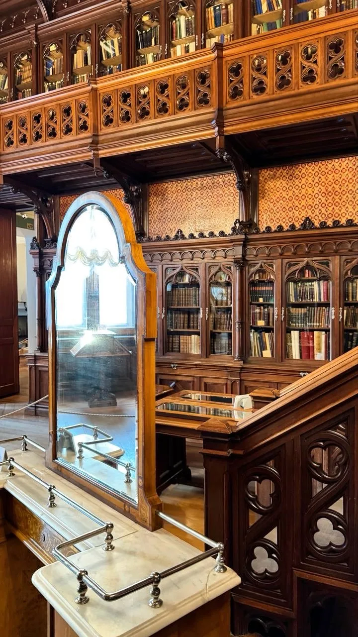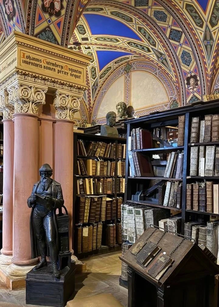 Больше всего впечатлил Кабинет Фауста — необычный уголок библиотеки, напоминающий монастырскую келью XV века. В центре — статуя первопечатника Иоганна Гутенберга, а на колоннах высечены надписи, прославляющие его и «первенцев типографского искусства». Дело в том, что здесь хранятся инкунабулы — книги, изданные до 1501 года, те самые первенцы эпохи книгопечатания. Они были настолько редкими и ценными, что их когда-то даже приковывали цепями к стенам и шкафам, спасая от кражи.