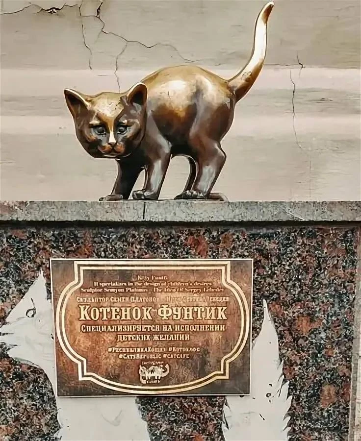 У кафе «Республика кошек» посетителей встречает бронзовый котенок Фунтик: по легенде, он исполняет детские желания. Адрес: ул. Якубовича, 10.