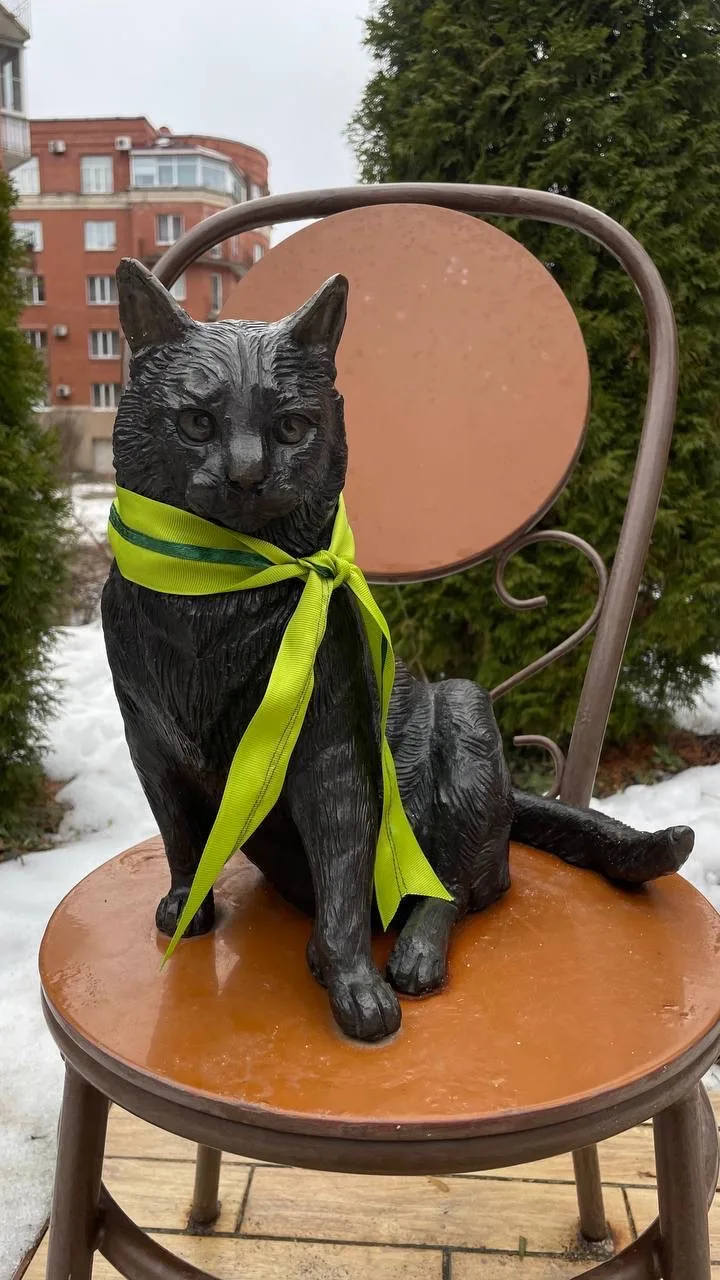В Озерках установлен памятник блокадной кошке: она сидит на стуле на улице Композиторов, 4, а заботливые горожане периодически меняют ей шарфики.
