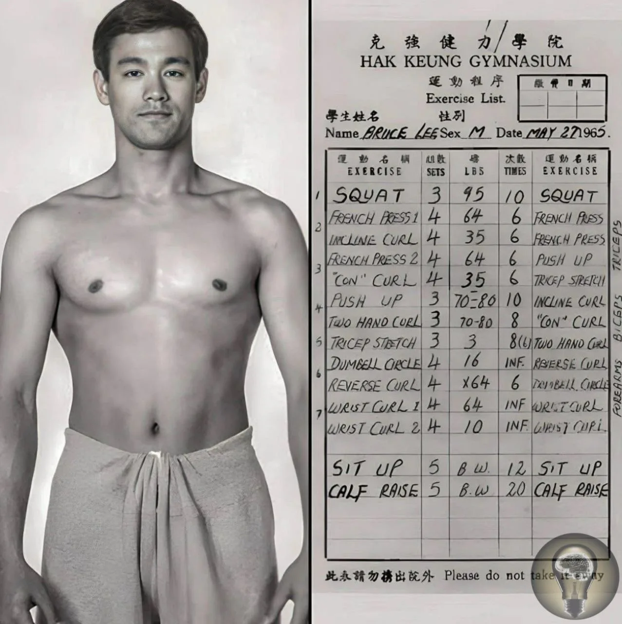 Тренировочная программа Брюса Ли, 1965 год. Один из немногих документов, показывающих системный подход Брюса Ли к физической подготовке — оригинальный перечень упражнений, составленный 27 мая 1965 года в «Hak Keung Gymnasium» в Гонконге. В нем содержится множество упражнений, включая приседания, жим лёжа, сгибания рук, упражнения на запястья и пресс. Все с точными указаниями по весам, подходам и количеству повторений.