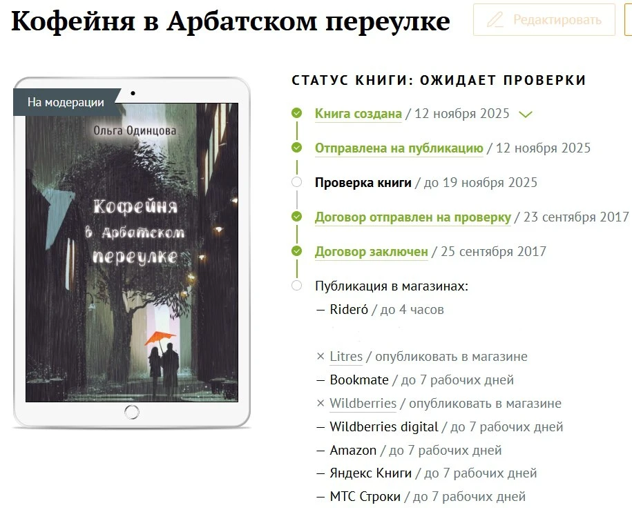Новости для адептов сервисов Яндекс Книги, МТС Строки, WB Digital и Амазон! В течение недели ждите появления повести «Кофейня в Арбатском переулке»! Постепенно там можно будет найти и все остальные мои истории.