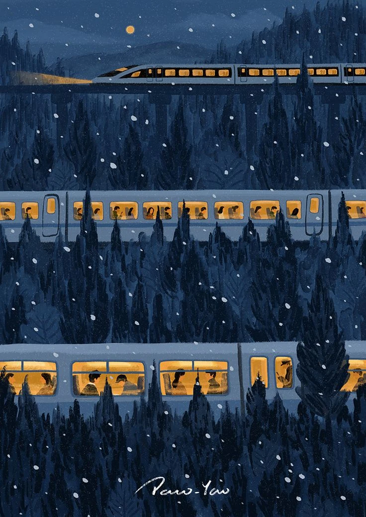 Сон, в котором ты сидишь в светлом купе поезда, а за окном в сумерках мелькает заснеженный лес 🌌