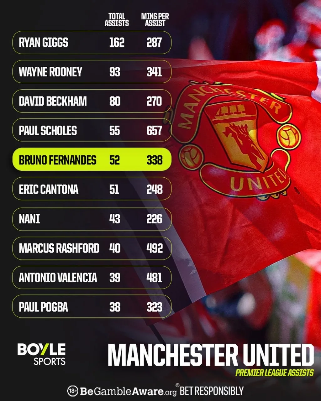 Бруну Фернандешу осталось всего 4 ассиста, чтобы войти в четверку лучших ассистентов в истории МЮ.