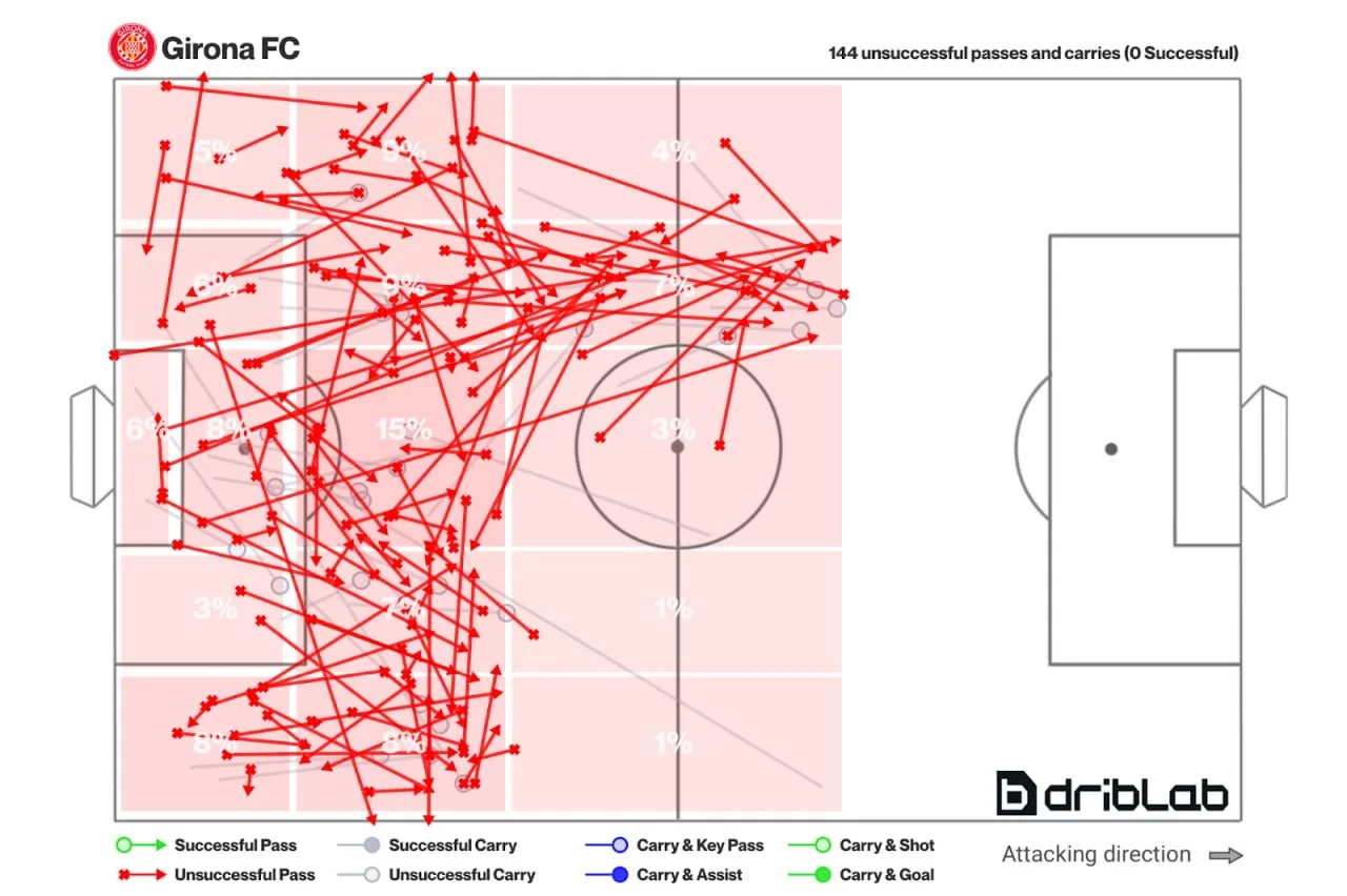 Об этом, в частности, свидетельствует второй график. Заметно, что «Жирона» катастрофически часто стала терять мяч в первых двух третях. Перехватов соперников в принципе стало больше. Для сравнения, в прошлом сезоне команда Мичела имела в среднем 16,21 фаз владения за игру, когда число передач переваливало за десять. По этому показателю ее опережали только «Реал» и «Барселона. Однако в этом году «Жирона» занимает по этому показателю восьмое место с конца.