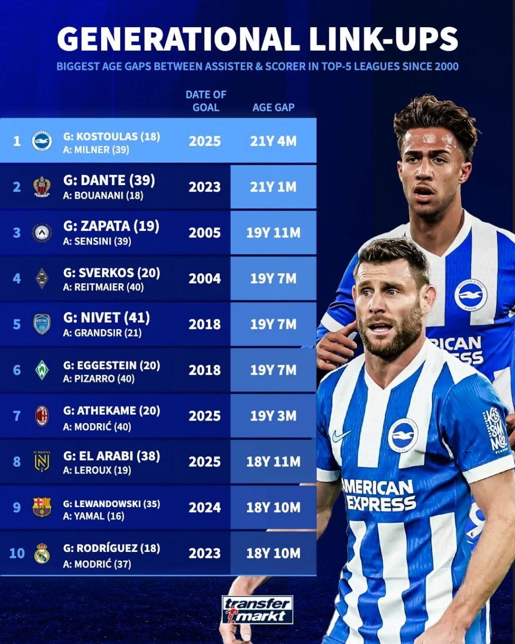 Ветеран и легенда «Ливерпуля» ассистировал Хараламбасу Костуласу, который даже не родился на момент его дебюта в чемпионате. Милнер дебютировал в Премьер-лиге в 2002 в возрасте 16 лет, а Костулас родился в 2007.