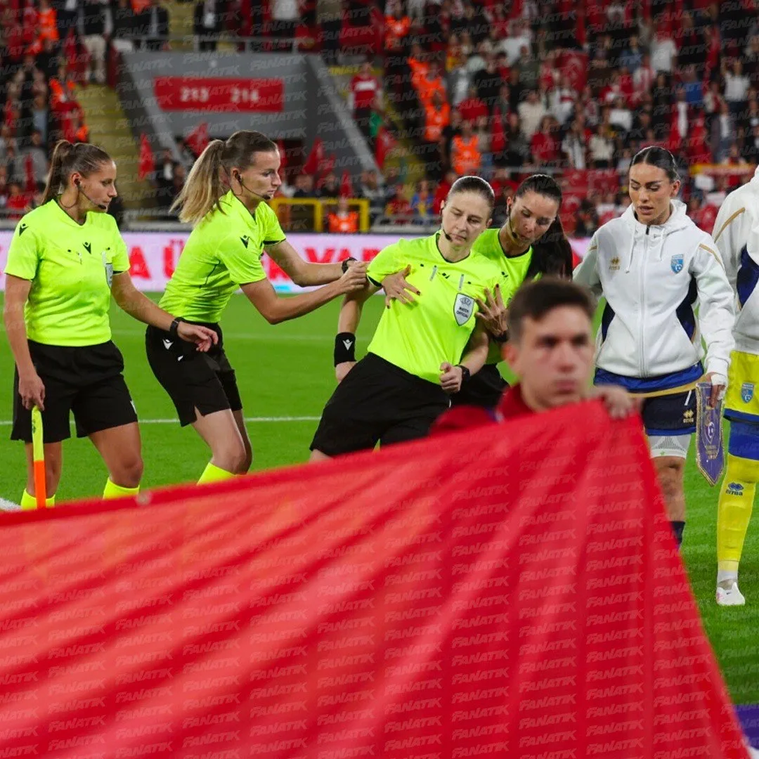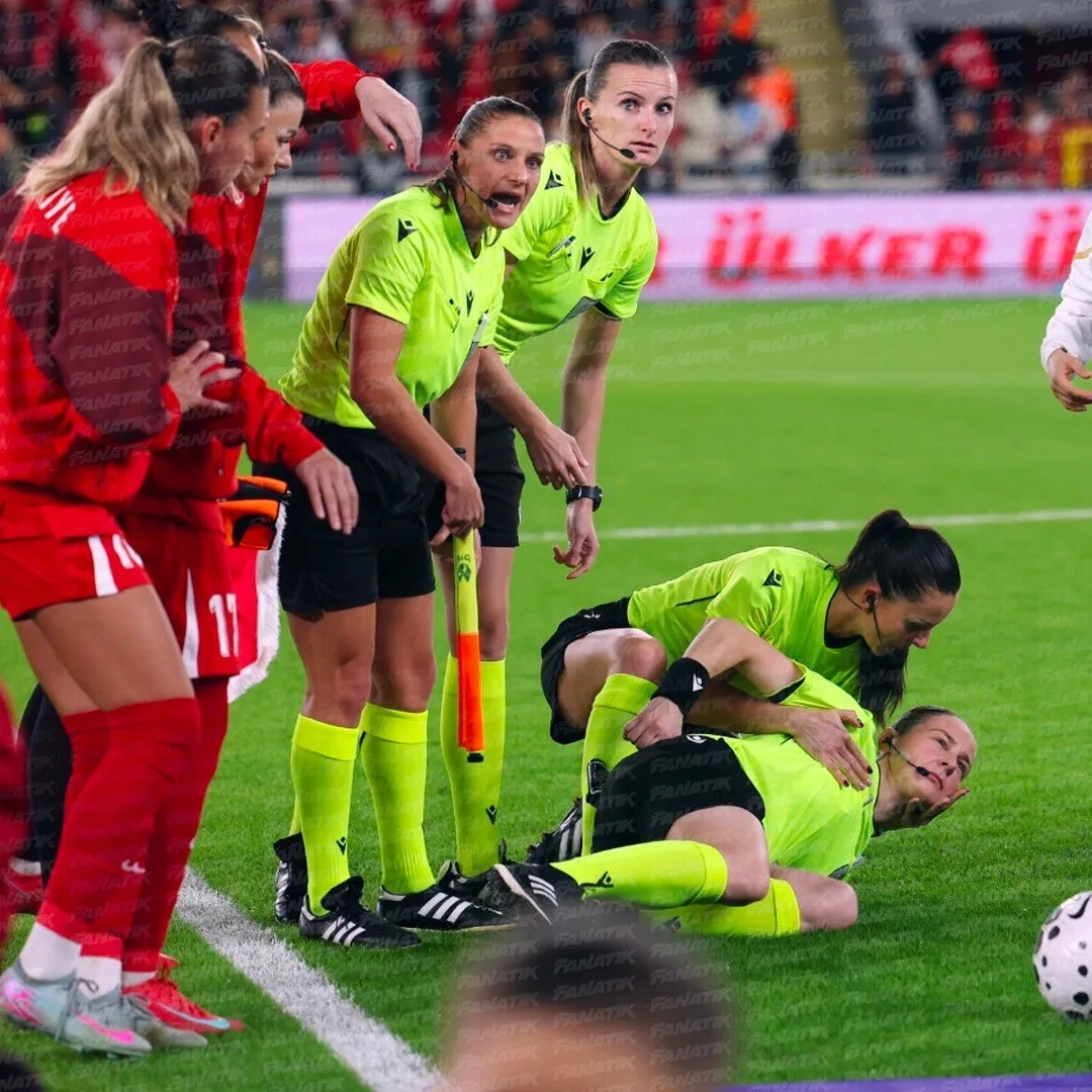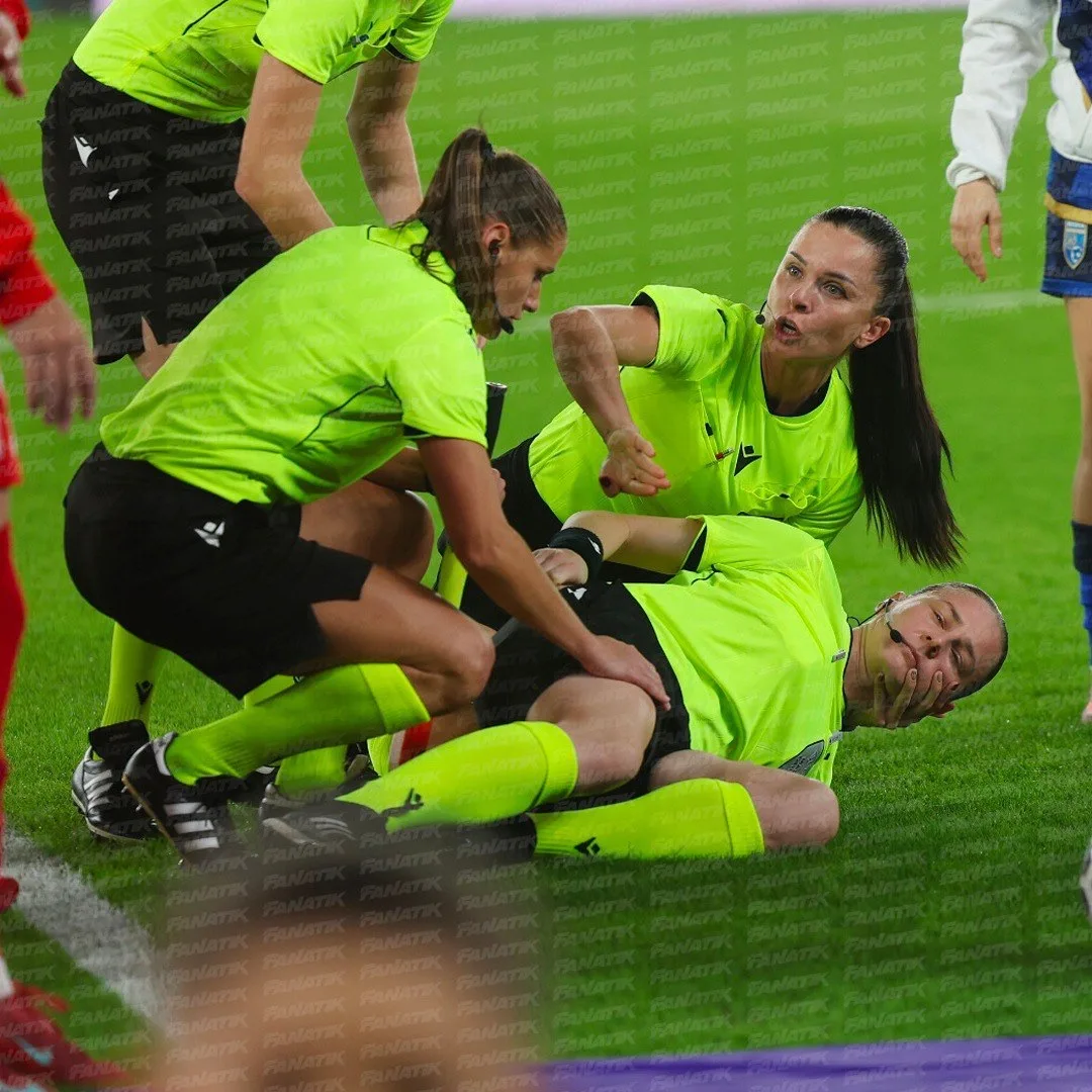На самом деле это судья Михалина Дьяков — она упала в обморок перед началом матча Турция – Косово. На поле выбежали медики и увели Михалину с поля, через некоторое время ей полегчало, а матч начали с небольшой задержкой — и новой главной судьей.