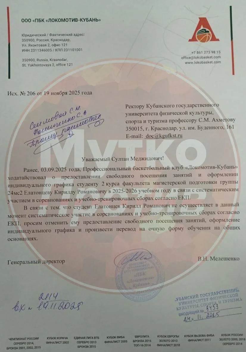 Баскетбольный клуб «Локомотив-Кубань» написал письмо в Кубанский университет физкультуры с просьбой отменить баскетболисту Кириллу Елатонцеву свободное посещение и индивидуальный график и заставить ходить на занятия на общих основаниях.