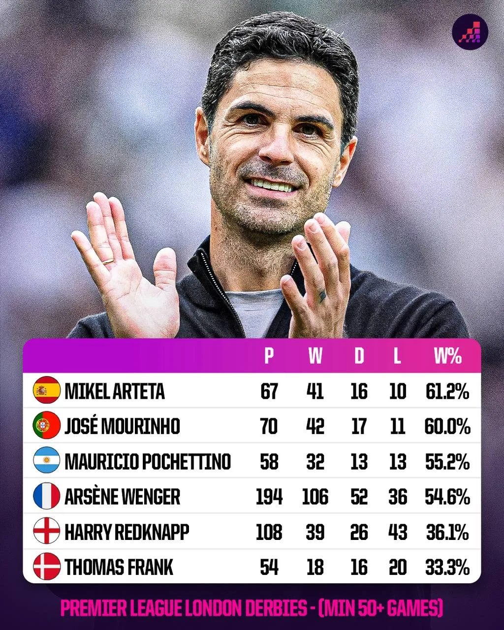 Именно Артета, а не Моуриньо или Венгер, является самым везучим тренером в столичных зарубах. Артета выиграл уже 41 матч, проиграв 10. Только ему и Особенному покорилась планка в 60+ процентов винрейта.