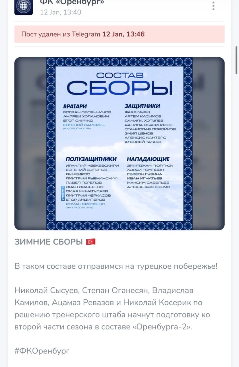 Интересно, что «Оренбург» сначала опубликовал пост, в котором указал, что Еременко находится на просмотре в клубе, а затем удалил его.