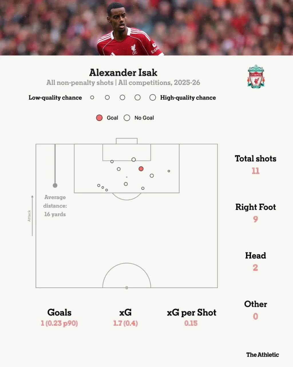 В четырех матчах в рамках АПЛ Исак отметился лишь одним ассистом – сам сетку ворот он пока не потревожил. Статистика по всем турнирам не лучше: в восьми играх за «красных» Александер имеет 1+1, но куда важнее даже не текущая голевая засуха, а отсутствие сдвигов в самой игре. Нападающий очень редко бьет по воротам (пока всего 11 раз), а его суммарный xG не пробил планку даже в два ожидаемых гола.