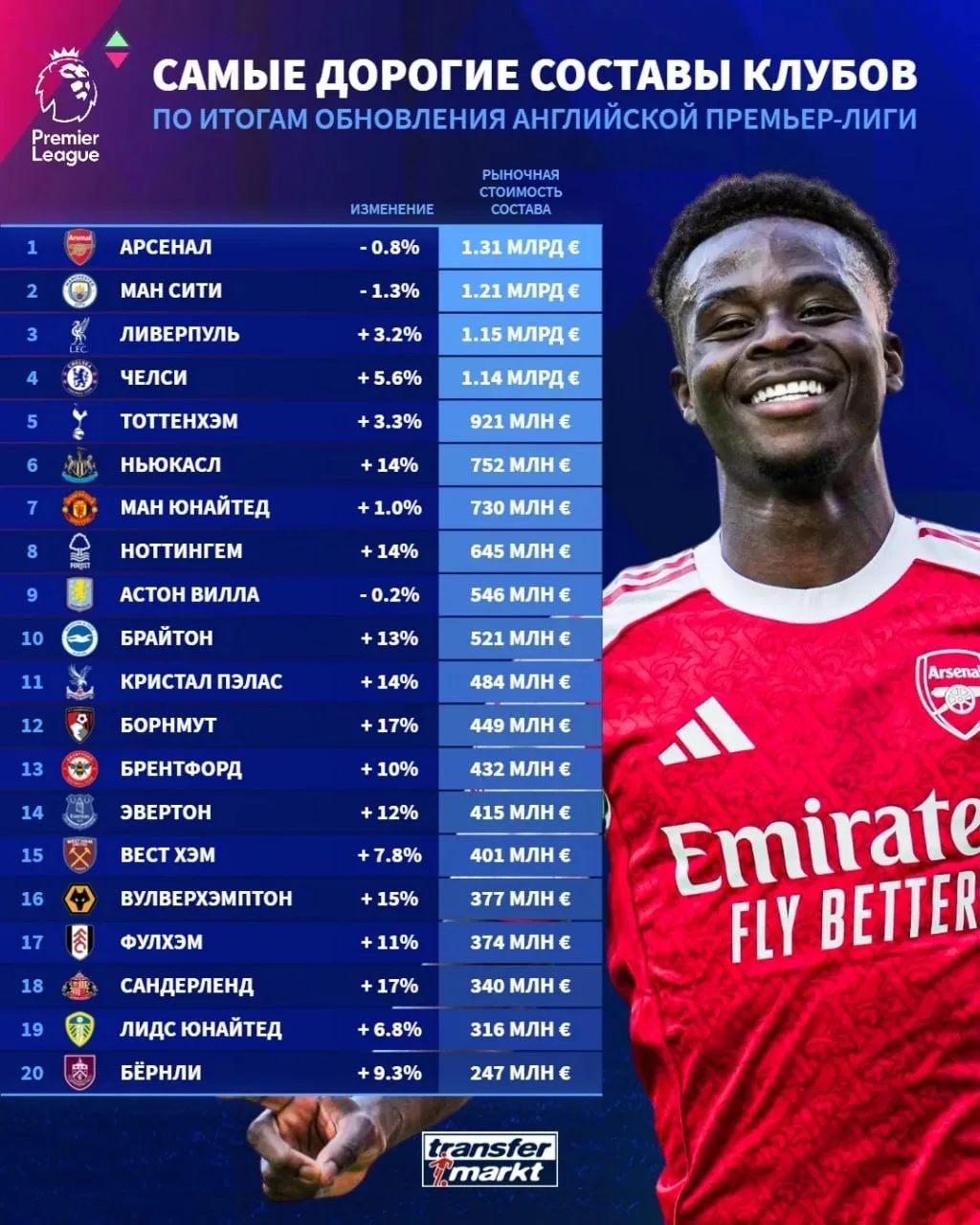 Transfermarkt недавно выкатил обновленные стоимости составов клубов АПЛ. Выделим пять любопытных моментов: