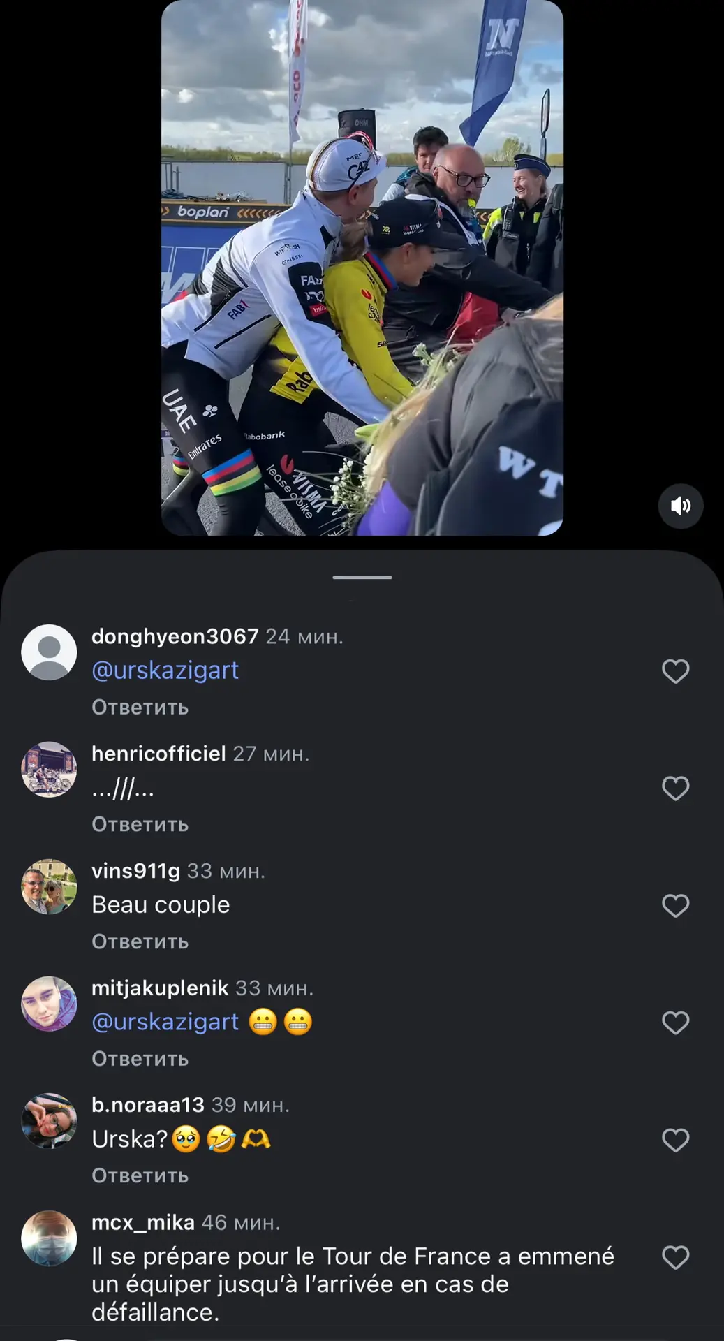 Вчера 27-летний словенский гонщик (и четырехкратный победитель Тур Де Франс) Тадей Погачар выиграл тур Фландрии. Казалось бы, выиграл и выиграл, но после гонки он вдруг решил хорошенько прокатить на своем велосипеде французскую велогонщицу, 34-летнюю Полин Ферран-Прево.