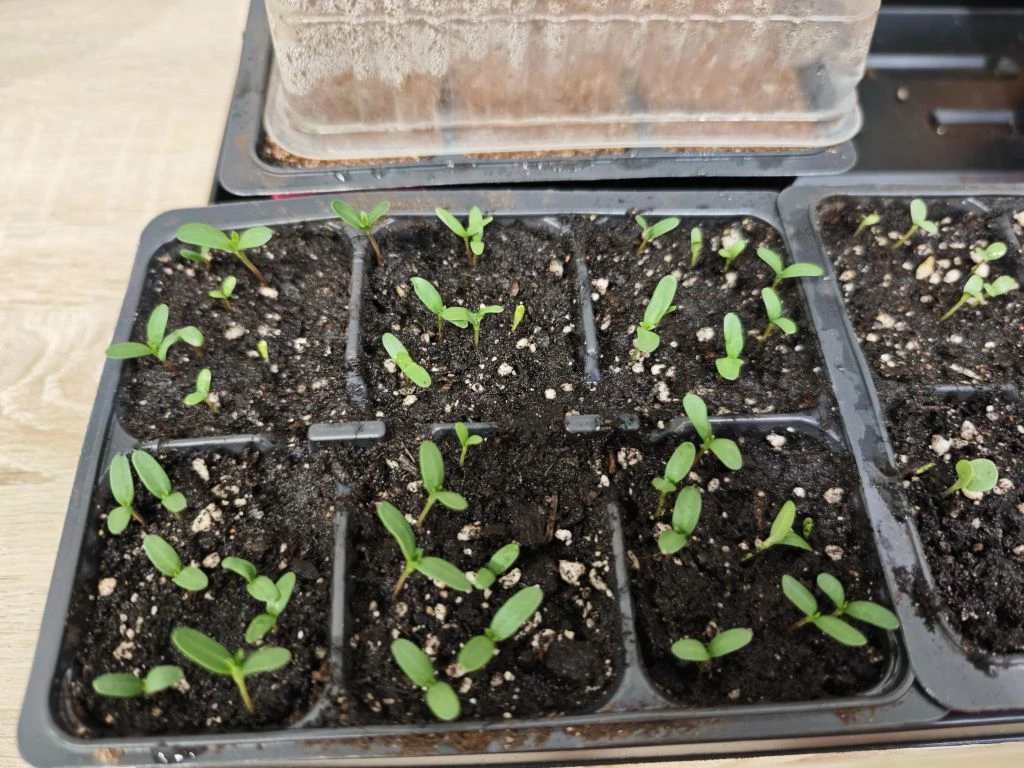 Всходы появляются неравномерно, из-за "торопыг" приходится убирать плёнку и следить, чтоб пустые ячейки, в которых пока нет всходов, не пересыхали, поливаю их по необходимости.