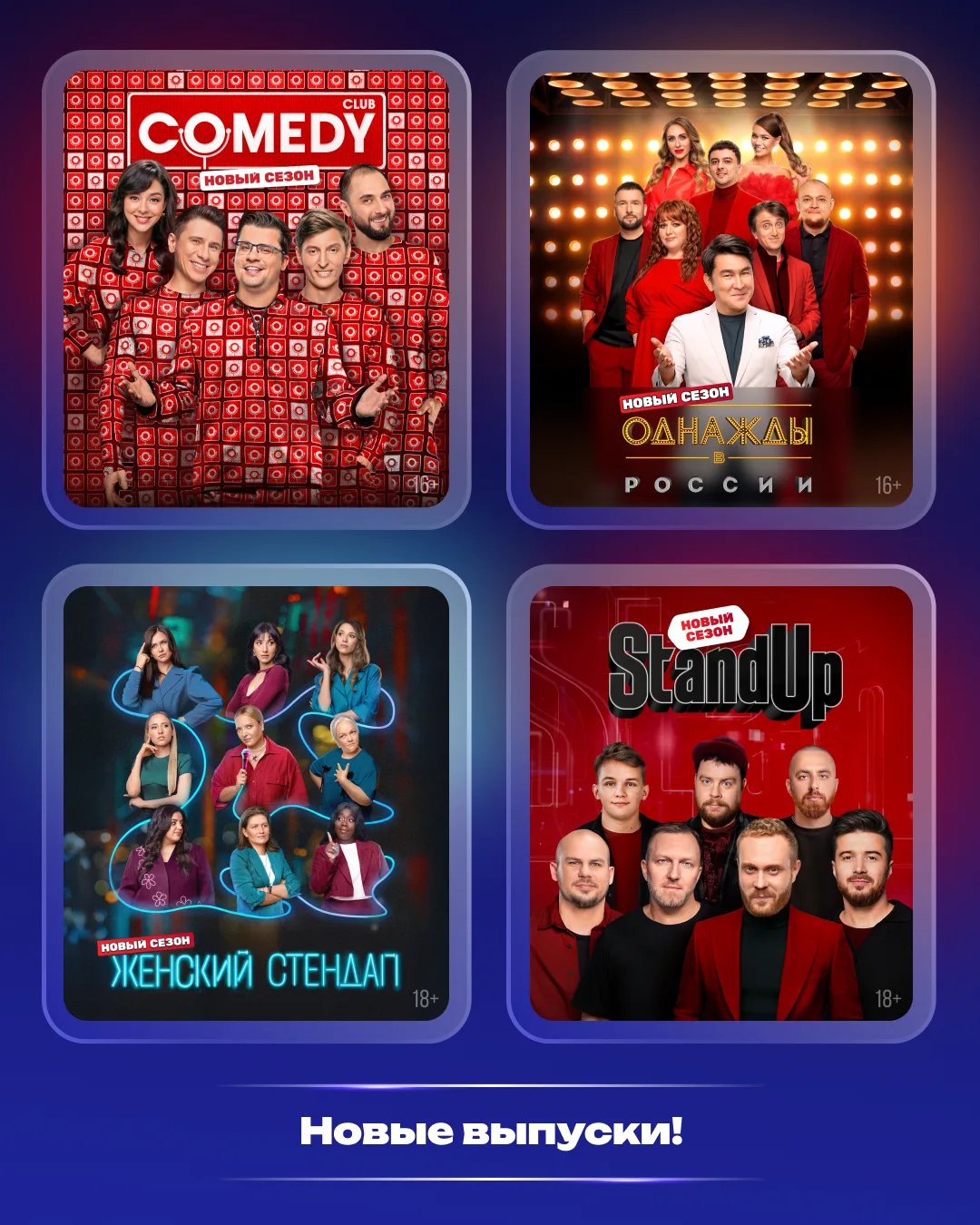 Смотрите свежие выпуски Comedy Club, Stand Up и «Однажды в России» только в Okko сразу после эфира на телеканале!