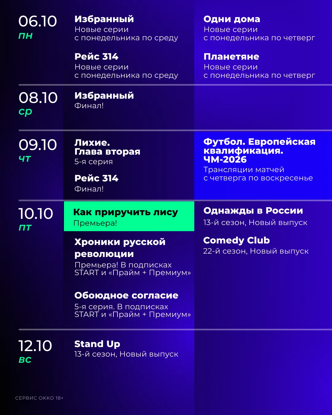 Премьера «КАК ПРИРУЧИТЬ ЛИСУ», новая серия «ЛИХИХ», финал комедии «ИЗБРАННЫЙ» и отборочные матчи ЧМ-2026!