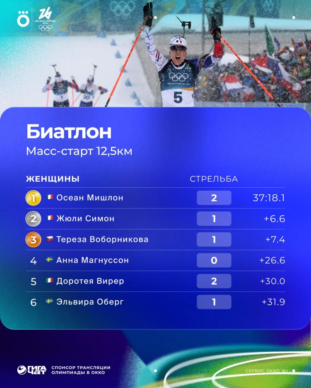 Мишлон выиграла масс-старт на Олимпиаде — 37:18.1 и 2 промаха за всю гонку! 👏🏻