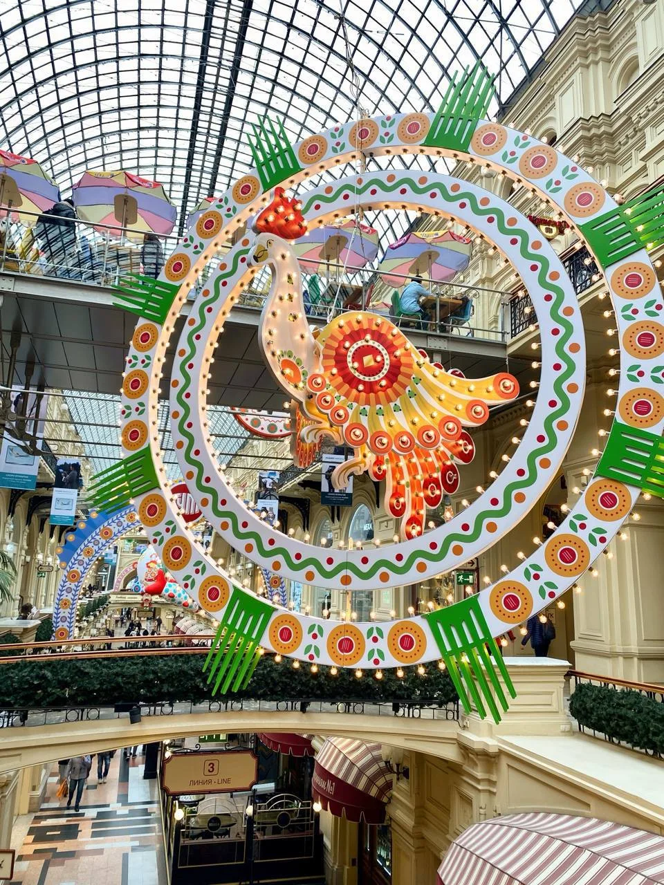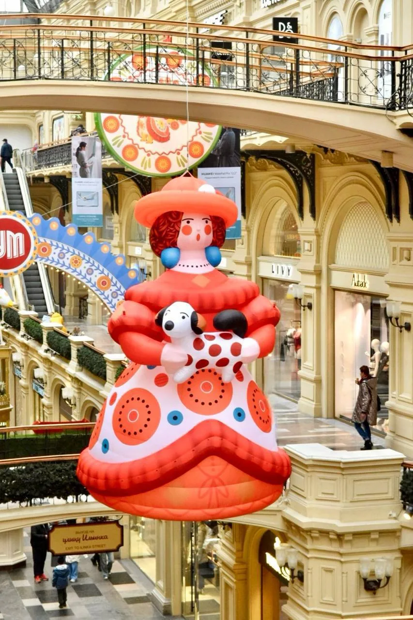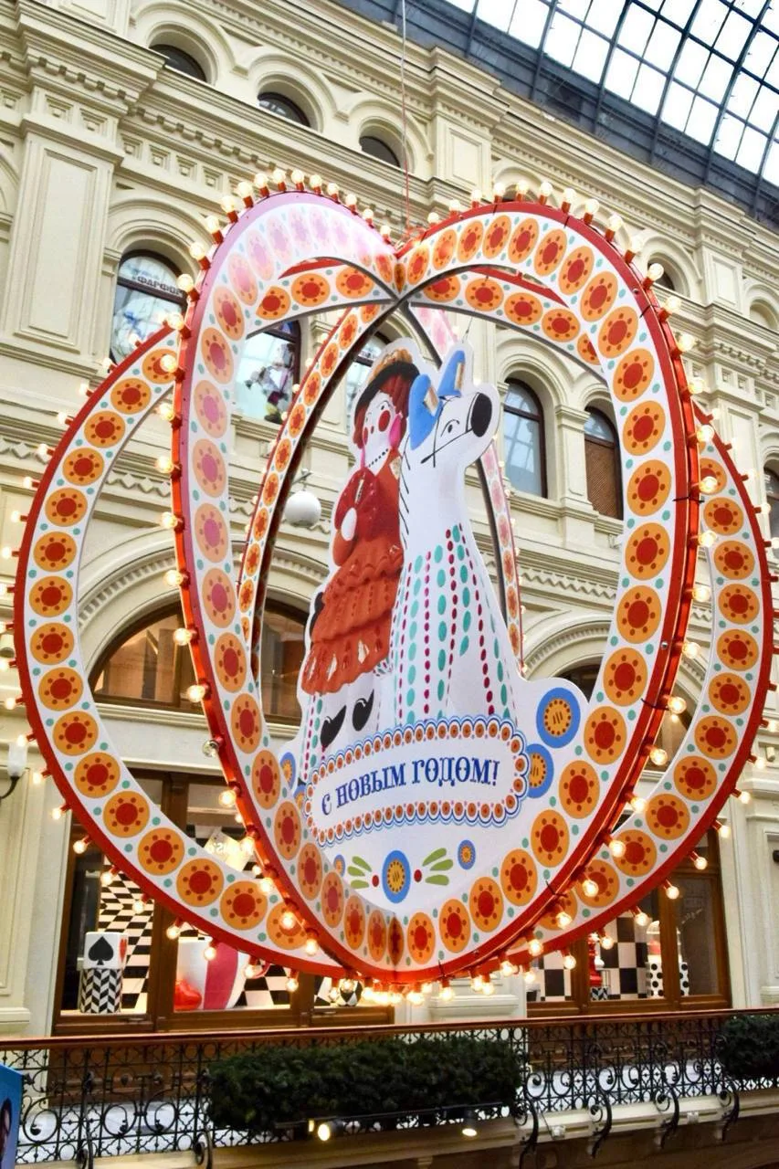 В этом году к Новому году ГУМ украшен в духе народных дымковских игрушек