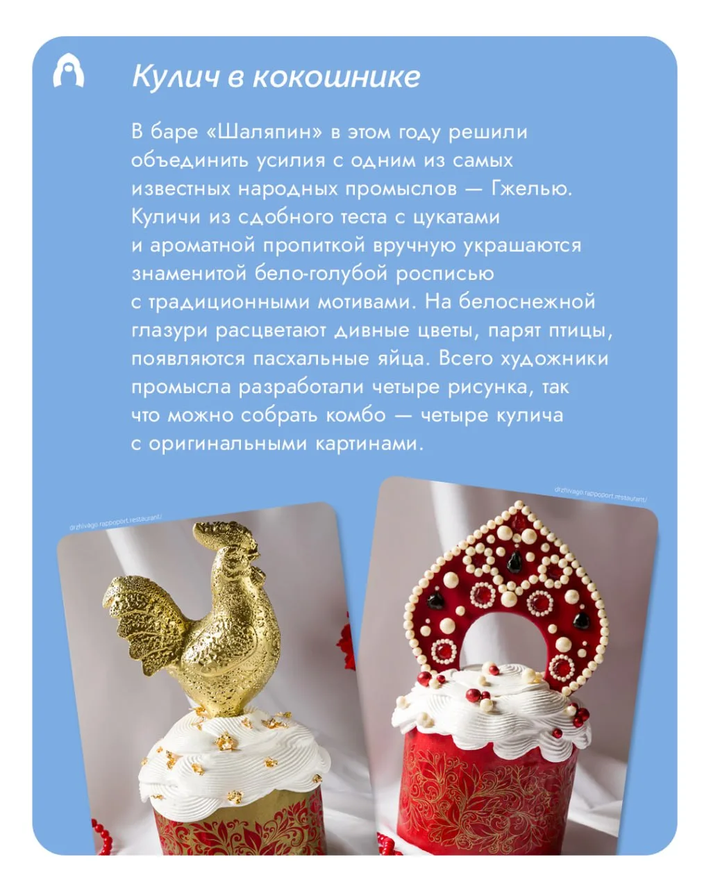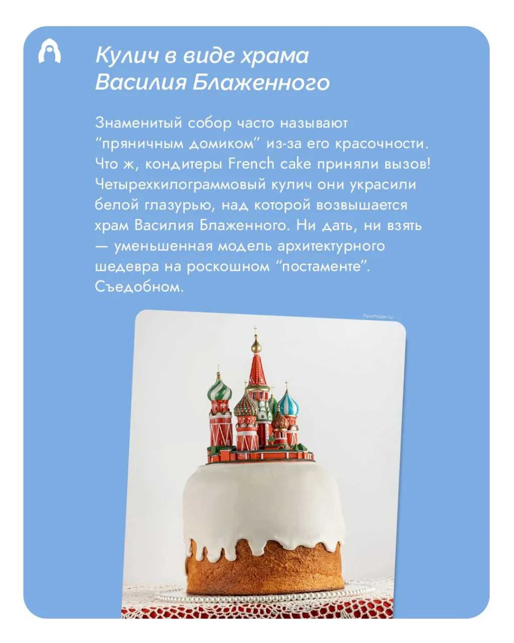 Столичные кондитеры предлагают праздничные десерты, украшенные старинными соборами, традиционной гжельской росписью и даже кокошниками.
