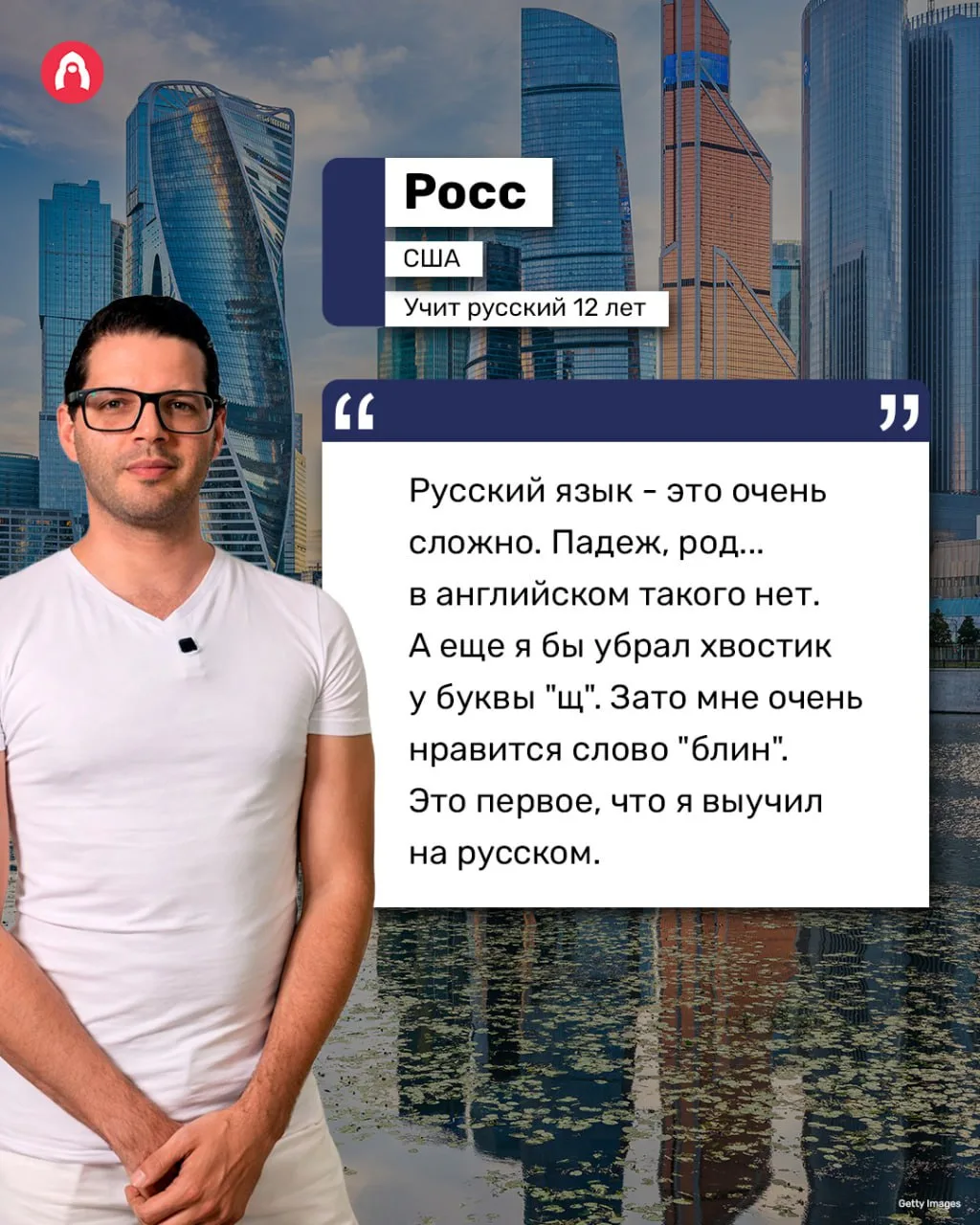 Росс женился на русской девушке. Теперь у них трое детей и они живут в Москве. Чтобы говорить с семьей по-русски, американец решил выучить язык. В прошлом году он проходил обучение в Летней школе Института Пушкина в Москве.