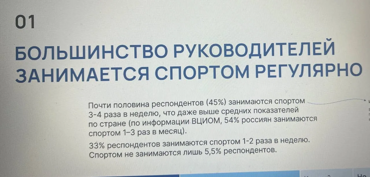 Есть и репутационный эффект: 57% считают, что спортивные привычки усиливают профессиональный образ человека. Спорт по-прежнему остаётся маркером дисциплины и самоорганизации.