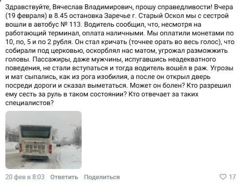 🫤В Старом Осколе водитель автобуса №113 высадил двух девушек посреди дороги из-за того, что они пытались оплатить проезд мелочью (монетами по 2, 5 и 10 рублей).