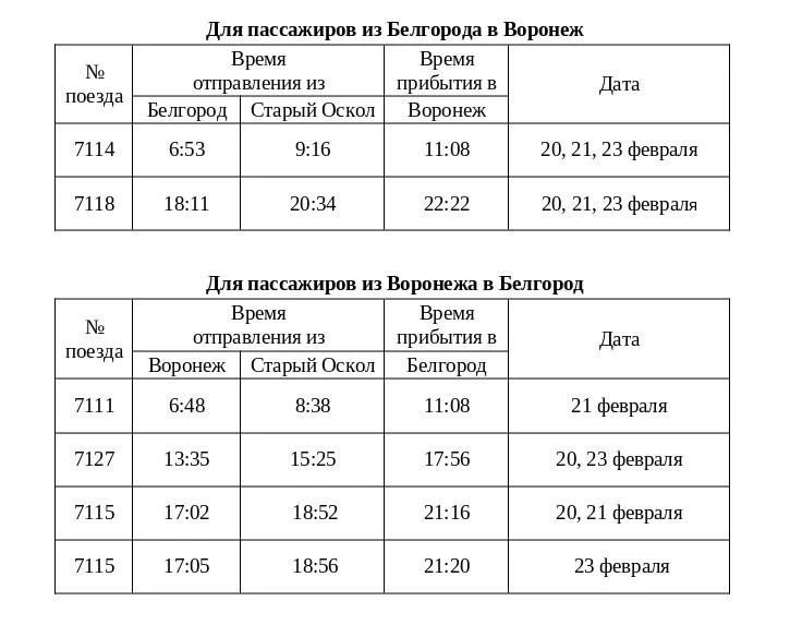 🚂 В связи с предстоящими выходными и праздничными днями поезда проекта «Соединяя Черноземье» по маршруту Белгород – Старый Оскол – Воронеж будут курсировать расписанию, представленному выше.