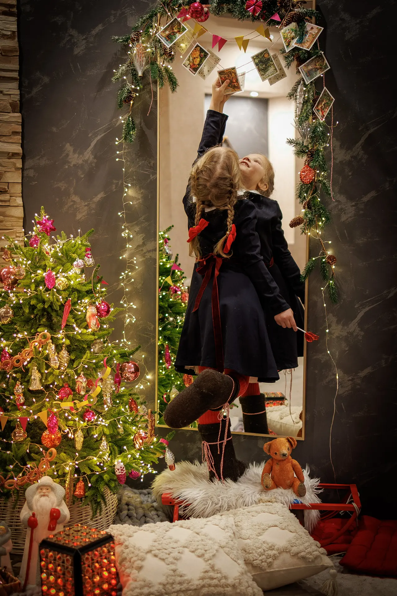 В этом году мы украсили елку старыми советскими игрушками, которые нам одолжила бабушка. Хрупкие стеклянные шары, расписанные вручную, словно рассказывают истории минувших лет. Гирлянды из бумаги, сушек и ретро открыток добавляют уюта и тепла. Все, что нашлось под рукой, все, что хранит в себе частичку нашего детства.